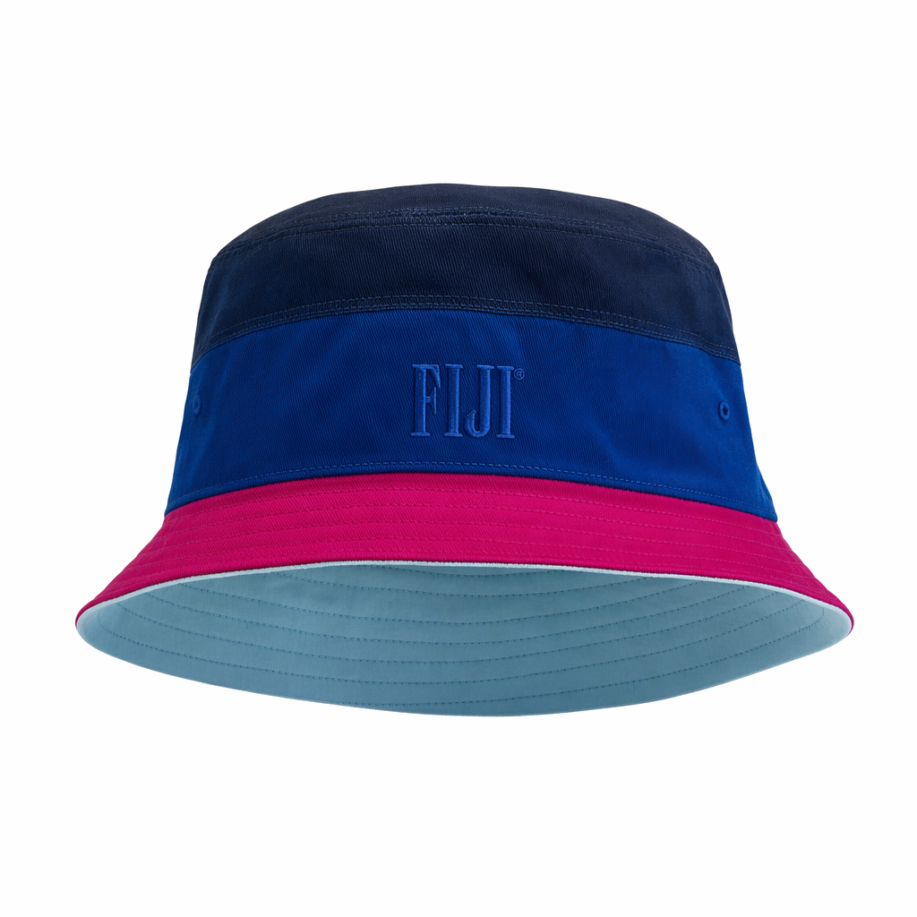 Photorealistic mockup of a FIJI Water slouchy bucket hat using the silhouette as the precise outline and structure. The hat paneling is divided into three horizontal color zones: deep navy crown (#041C2C) at the top, blending into primary FIJI blue (#003DA5) through the middle, then a narrow hibiscus magenta (#E10098) stripe running just above the brim edge, wrapping 360 degrees. The underside of the brim is light blue (#BBDDE6) for a subtle surprise when flipped. A small tonal FIJI logo is embroidered above the magenta stripe in matching FIJI blue for a low-key, non-ostentatious flex. Fabric is soft brushed cotton twill with a slightly textured, matte finish. Designed for Gen Z beach and festival wear: relaxed, cool, well-traveled energy. Shot on a seamless pure white background with soft, diffused daylight-style studio lighting, minimal shadows to keep the hat floating and crisp. Camera angle is slightly above and front-facing, showing enough of the crown and brim to clearly see all color bands and the interior underside color. Ultra-detailed stitching, visible seams, realistic depth and structure.