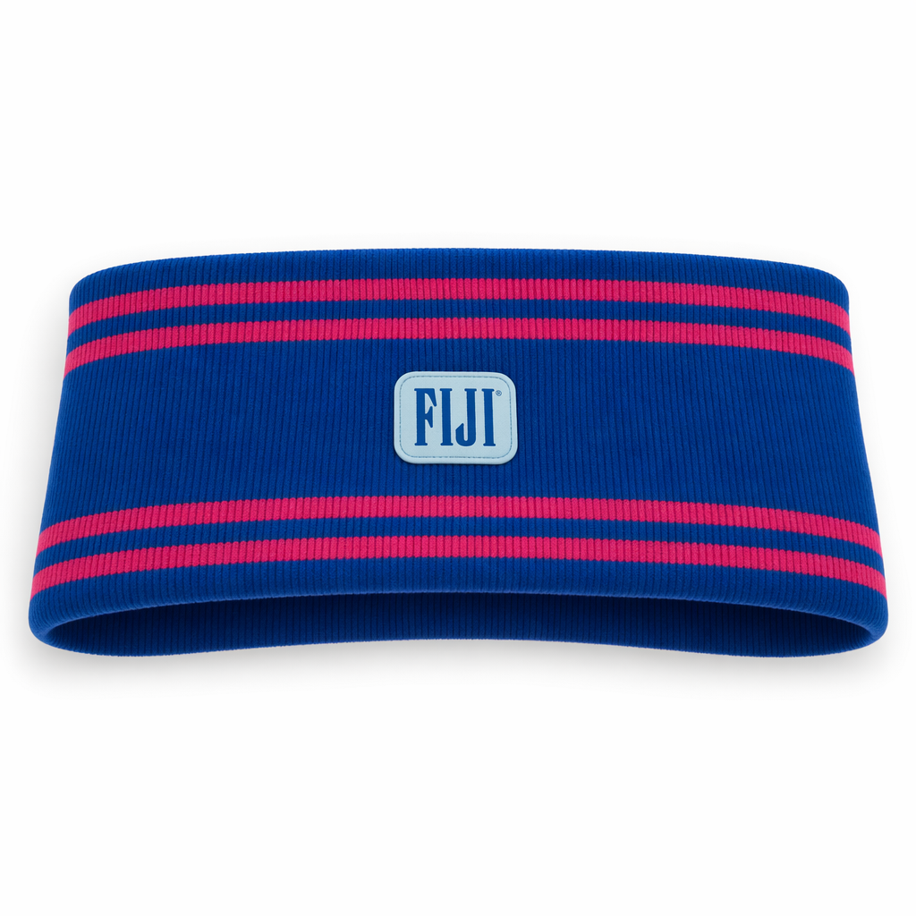 Photorealistic FIJI Water ribbed headband / ear warmer using the silhouette shape as the exact profile, floating on a clean white background. The headband has bold, sporty horizontal striping: a wide primary FIJI blue (#003DA5) base with two thinner hibiscus magenta (#E10098) stripes near the top and bottom edges, creating a graphic but minimal look. Center front features a small, debossed rubber patch in light blue (#BBDDE6) with the FIJI logotype in FIJI blue, giving a subtle athleisure-meets-chill vibe, more relaxation and style than hardcore performance. Material is double-layered, stretchy ribbed knit (think premium lounge activewear), matte and ultra-soft, with visible rib texture and clean finished edges. Lighting is bright and evenly diffused, front-facing, creating gentle shadowing under the lower edge to suggest depth but no harsh contrasts. Camera is a straight-on, slightly elevated front shot, with the band slightly curved to imply how it would sit on a head, but shown standalone. The overall aesthetic is Gen Z street-lounge: clean, minimal, comfortable, emotional connection to everyday rituals like morning walks or sunset hangs.