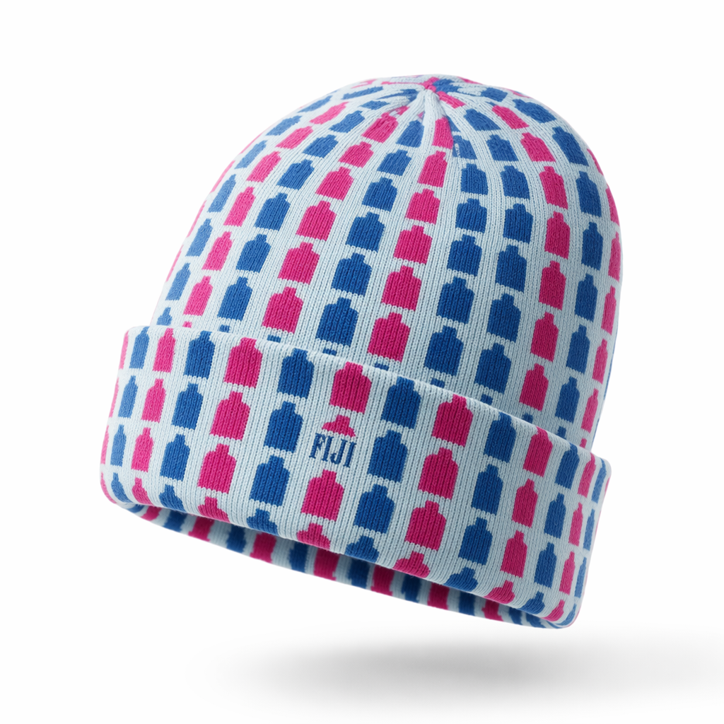 Photorealistic FIJI Water patterned beanie using the silhouette as the exact hat shape, presented floating on crisp white. The beanie features an all-over tessellated pattern of small, square FIJI bottle silhouettes in alternating FIJI blue (#003DA5) and hibiscus magenta (#E10098) on a soft light-blue (#BBDDE6) base, subtly referencing FIJI’s iconic square bottle in a playful, Gen Z graphic way. The pattern is clean and sharp, with the squares aligned in a grid wrapping around the hat, slightly distorted at the crown to follow fabric curvature. No big logo; instead, a tiny FIJI wordmark is knitted into the pattern near the cuff, tone-on-tone in FIJI blue. Fabric is fine-gauge jacquard knit, smooth and premium, with a soft matte finish and delicate texture visible up close. Lighting is high-key studio with a light source from front-left, soft shadows on the right side and under the beanie to ground it. Camera is a slightly low front angle, 3/4 view to showcase the pattern continuation and crown detail, with strong focus and shallow depth of field fading toward the back edge. Ultra-clean, editorial yet approachable.