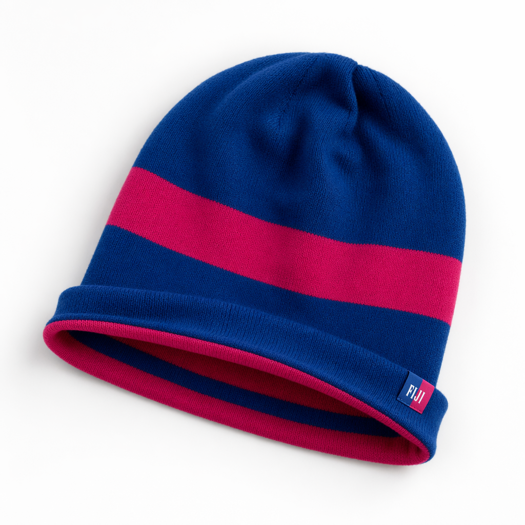 Photorealistic FIJI Water reversible beanie using the silhouette as the exact form, displayed lying flat on a white background with a slight roll at the edge to show the reverse color. The outer side is predominantly primary FIJI blue (#003DA5) with a single bold hibiscus magenta (#E10098) stripe running horizontally across the middle, clean and graphic. The inner side, visible at the rolled edge, is flipped: magenta body with a FIJI blue stripe, delivering a playful, personal choice for the wearer. A minimal woven FIJI tag is placed at the side seam, one half FIJI blue, one half magenta, with white logo crossed at the color boundary. The knit is smooth, fine merino-cotton blend, with a soft hand and subtle sheen from the fiber, still firmly in matte territory. Lighting is soft daylight-mimicking studio light from top, creating delicate shadows on the folds and revealing the dual-layer thickness. Camera is a top-down overhead shot, slightly off-center composition to feel editorial but still focused on product, ultra-sharp detail. Gen Z-focused, relaxed, reversible styling as a personal expression of mood.