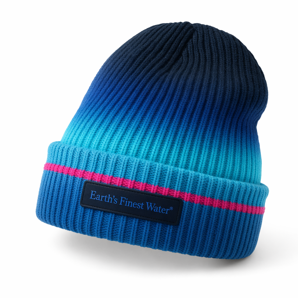 Photorealistic FIJI Water cuffed beanie using the silhouette as the precise shape, styled for a fashion-forward Gen Z audience but kept effortless and wearable. The beanie’s body features a soft gradient stripe effect: starting in deep navy (#041C2C) at the crown, blending into FIJI blue (#003DA5), then fading into bright light blue (#00C1D5) just above the cuff. Across the cuff itself runs a slim hibiscus magenta (#E10098) stripe, like a horizon line, wrapping evenly. At center front of the cuff is a small, tonal silicone patch in navy with a debossed “Earth’s Finest Water®” line in FIJI blue, subtle but tactile. Knit is chunky ribbed with visible vertical ribs that catch light, conveying coziness and premium weight. Background is pure white, seamless; lighting is soft but directional from upper left, highlighting rib texture and the gradient. Camera is a straight-on shot with the beanie slightly rotated to the right, showing both front patch and side gradient flow, with a small soft shadow beneath. Overall mood: chill après-beach or post-sunset walk, not performance gear.