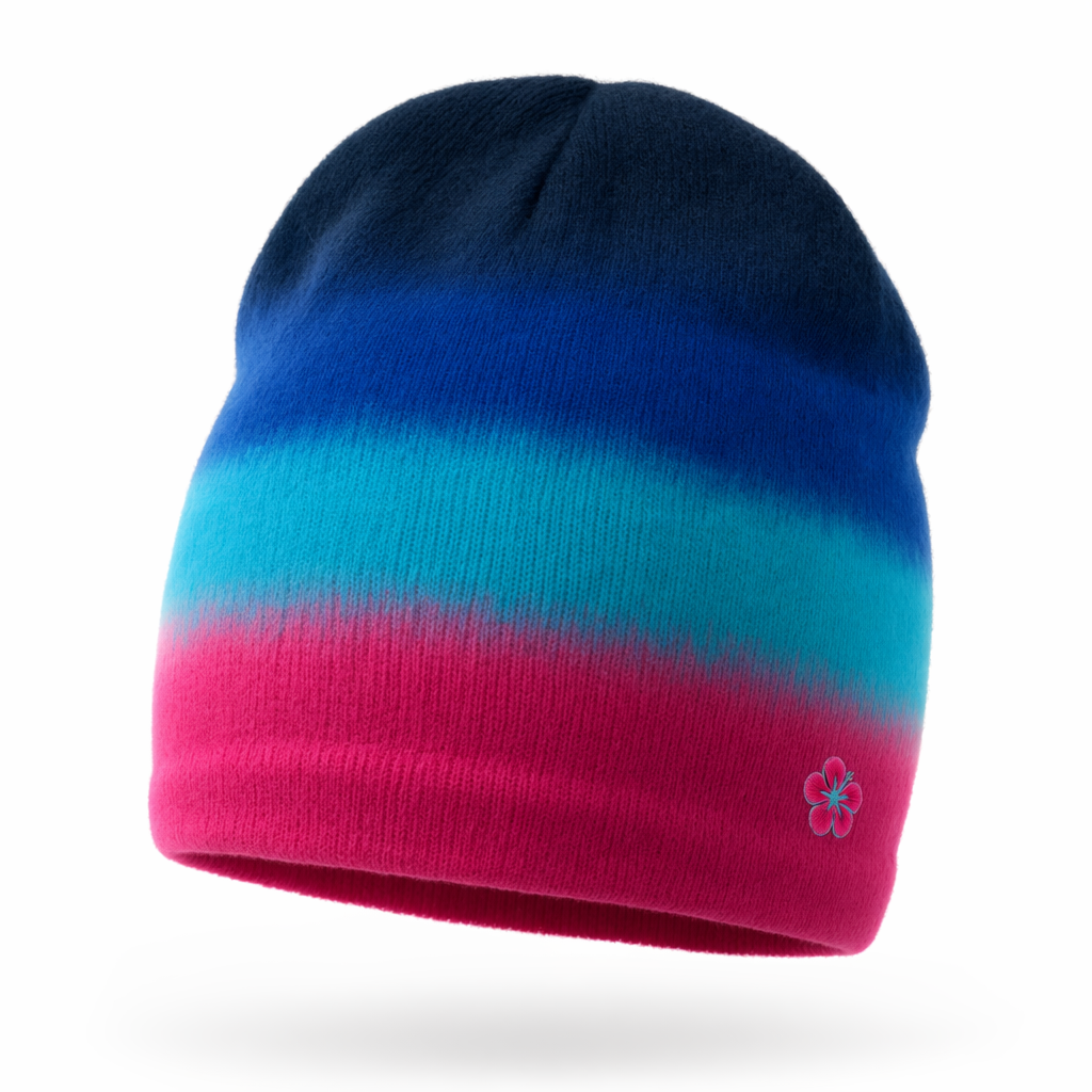 Photorealistic FIJI Water ‘sunrise stripe’ beanie using the silhouette as the exact form, floating centered on a bright white background. The beanie’s stripes evoke a tropical island dawn: from crown downward, a band of deep navy (#041C2C) transitioning to FIJI blue (#003DA5), then bright light blue (#00C1D5), ending in a bold hibiscus magenta (#E10098) band near the base. Stripes are relatively wide and softly blended at their boundaries while still distinctly readable, giving a dreamy, escapist feel. No large graphics; instead, a micro-embroidered FIJI hibiscus icon in magenta and light blue sits discreetly near the side seam. Material is brushed cashmere-blend knit, ultra-soft, with very fine, visible fibers and a velvety matte texture, conveying ‘affordable luxury for everyday’. Lighting is very soft, wraparound studio light with minimal shadow, giving the hat a plush, cloudlike presence. Camera angle is a slightly above 3/4 front view, allowing the viewer to see the full vertical color story from crown to hem in one glance. Extremely high detail and realistic fabric rendering.