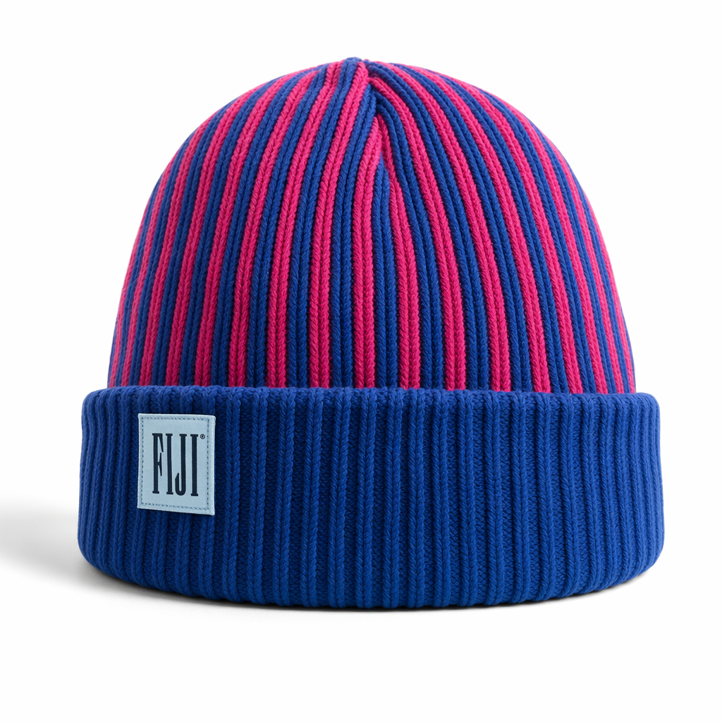 Photorealistic mockup of a FIJI Water unisex knit beanie using the provided silhouette as the exact shape and proportions. The beanie features bold horizontal stripes: primary FIJI blue (#003DA5) and hibiscus magenta (#E10098) alternating in equal-width bands wrapping cleanly around the hat, with crisp edges and no distortion. A small, woven FIJI Water label in white with FIJI blue logo is stitched on the front cuff, centered, minimal and premium. Fabric is dense, ribbed cotton-blend knit with a soft, slightly plush texture, matte finish, no shine. The overall vibe is laid-back, coastal streetwear for Gen Z: effortless but intentional, affordable luxury they’d actually wear daily. Lighting is bright, even studio lighting from above and slightly to the left creating soft shadows and subtle texture highlights in the knit. Background is pure clean white, seamless, no props. Camera is straight-on product shot at eye level, slight 3/4 rotation to show both front label and side stripe continuity, tightly framed with a little breathing room. Ultra-high resolution, hyperreal, e-commerce ready.