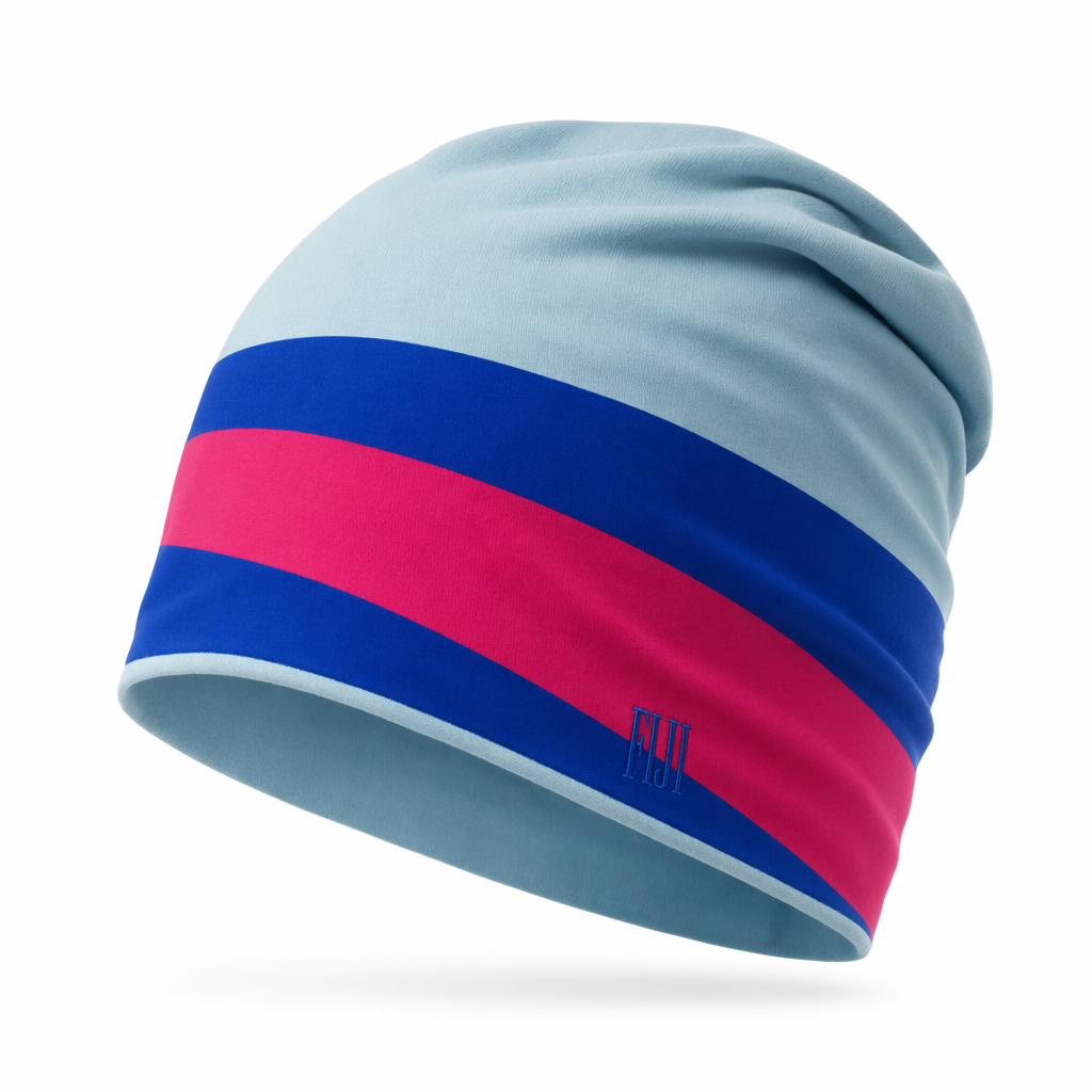 Photorealistic FIJI Water lounge beanie using the silhouette as the exact outline, styled as a soft, slightly slouchy cap floating over a clean white background. The beanie is primarily light blue (#BBDDE6) with a bold, asymmetrically-placed diagonal stripe panel wrapping around from front-left to back-right in FIJI blue (#003DA5) and hibiscus magenta (#E10098). The diagonal panel is sliced into three equal bands (blue–magenta–blue), giving a dynamic yet relaxed visual rhythm that feels modern and Gen Z. At the lower edge of the diagonal stripe on the front, a tiny, tonal FIJI wordmark is embroidered in matching FIJI blue, subtle and close-up. Fabric is lightweight, smooth jersey knit (blend of cotton and modal), drapey with soft folds, matte with delicate highlights. Lighting is soft and frontal with a slight top component, emphasizing gentle drape shadows and contours. Camera is 3/4 front view, slightly above, capturing both the slouch and the wrap of the diagonal panel. No props, pure white seamless background for a fresh, minimalist look.