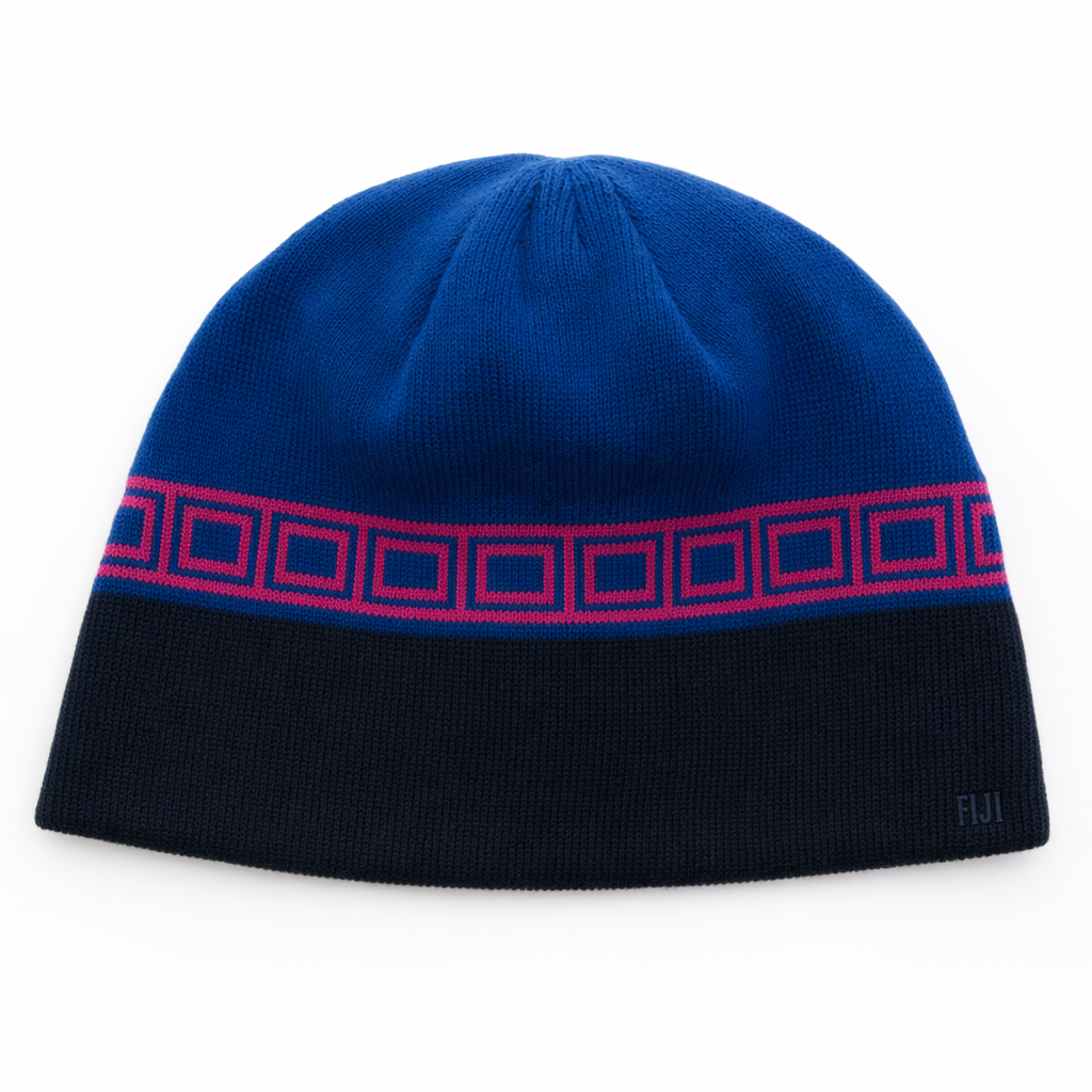 Photorealistic FIJI Water ‘square wave’ beanie using the silhouette as the precise form, centered on a stark white background. The beanie features geometric horizontal banding that nods to FIJI’s square bottle: a broad FIJI blue (#003DA5) band at the top, beneath it a band of interlocking square outlines in hibiscus magenta (#E10098) running horizontally as a stripe motif, then a solid navy (#041C2C) band at the base. The square outlines are thin, crisp, and evenly spaced, creating a subtle, graphic pattern that feels techy and fresh to Gen Z but still understated. The FIJI logo is very small, placed at the back in navy, almost hidden, making the design more about graphic language than overt branding. Material is midweight wool-blend knit with clean, uniform stitches, semi-matte with slight sheen on the square outlines where the yarn is tighter. Lighting is clean, high-key with a front-top light and a secondary fill to eliminate harsh shadows, giving just enough depth. Camera is a straight-on front shot with very mild tilt to the right, showing the band proportions and pattern clarity in a hyper-detailed, realistic style.