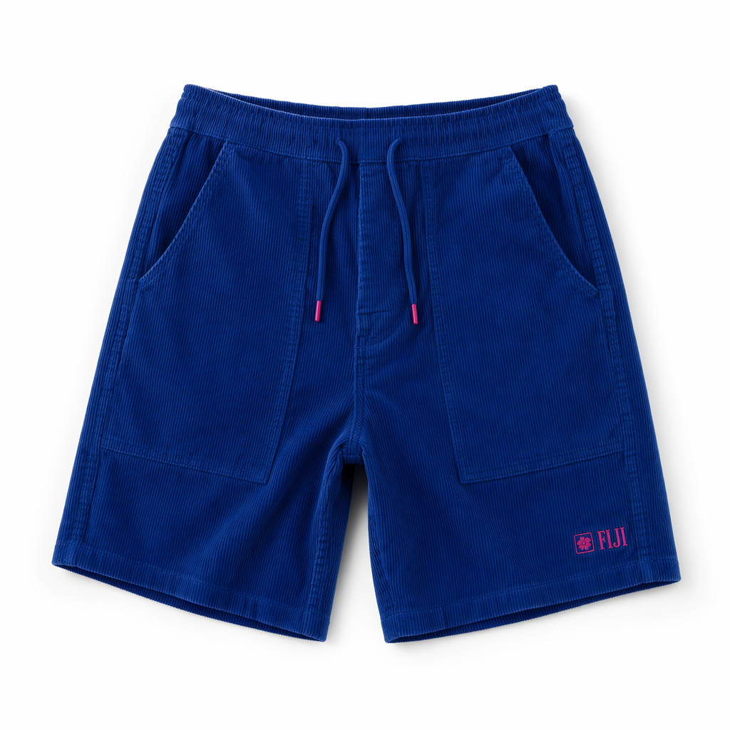Photorealistic mockup of FIJI-branded unisex corduroy shorts using the provided silhouette 02_classic-corduroy-shorts-oregano.jpg as the exact garment shape. Mid-thigh, relaxed fit, soft wide-wale corduroy rendered in a saturated FIJI primary blue (#003DA5) with a subtle vertical rib texture. A minimal embroidered FIJI wordmark in hibiscus magenta (#E10098) sits small on the left hem, paired with a tiny square icon inspired by the FIJI bottle label, giving an ‘if-you-know-you-know’ feel. Add an elastic waistband with a clean hidden drawstring tips dipped in magenta. Lighting is bright, diffused studio light from the top left, no harsh shadows, on a clean matte white background to emphasize color and texture. Camera is straight-on, slightly elevated, showing the full shorts with a gentle fabric drape and crisp stitching detail, no model, just the floating garment. Style should feel premium, modern, Gen Z streetwear-adjacent, but effortless and laid-back, evoking ‘Earth’s Finest Water’ as an affordable luxury daily uniform piece.