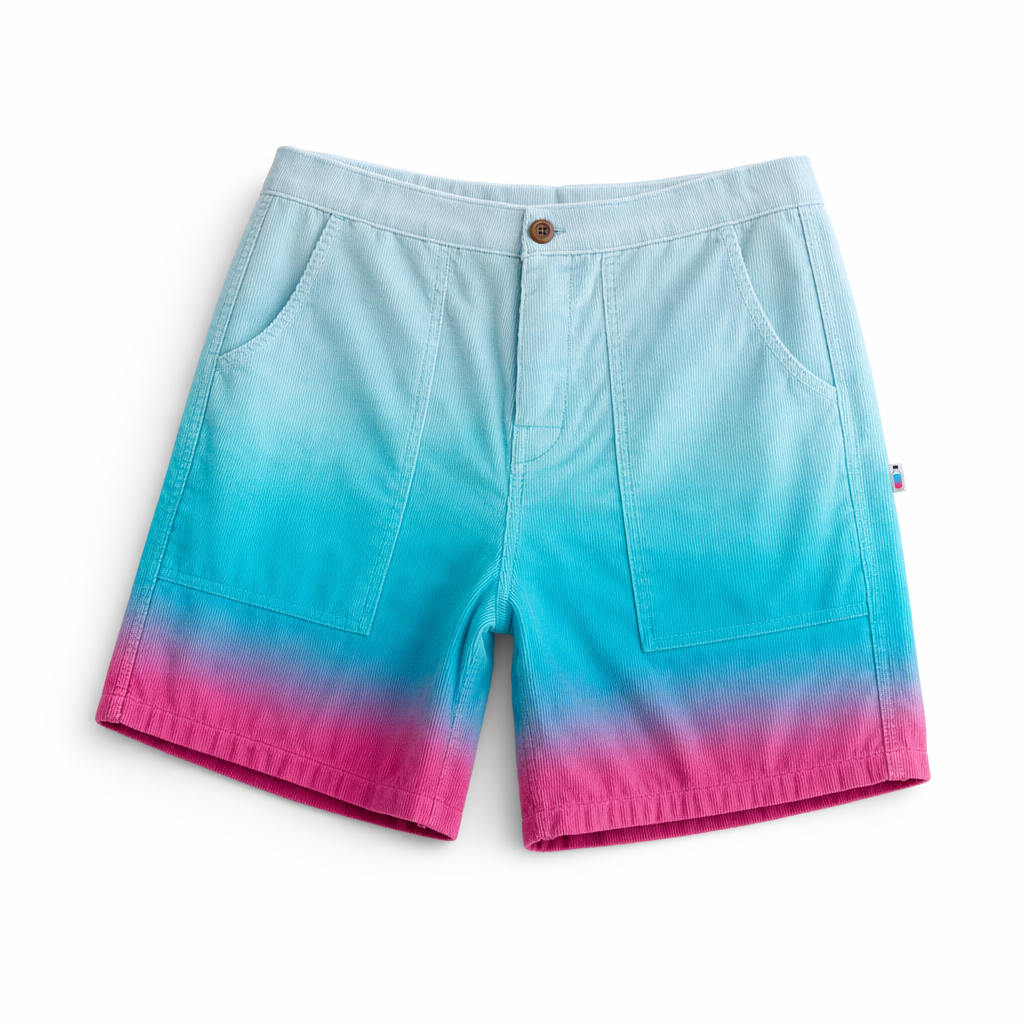 Photorealistic mockup of FIJI ‘sunrise’ corduroy shorts using silhouette 02_classic-corduroy-shorts-oregano.jpg. Keep the classic relaxed corduroy short shape, but render the fabric in a soft gradient dip-dye effect: top of the shorts in light FIJI ice blue (#BBDDE6) transitioning smoothly into bright FIJI aqua (#00C1D5) at mid-thigh, and finishing with a subtle hibiscus magenta (#E10098) tint right at the hem ribs, like a tropical sunrise reflected on water. Corduroy is medium-wale, plush, slightly velvety, with crisp seams. On the right side seam, a very small woven tab label carries a miniature FIJI square bottle icon in blue and magenta. Waistband elastic with tonal stitching; no visible drawcord for a clean, elevated finish. Shot on pure white background with soft even lighting, faint shadow under the shorts to ground them. Camera centered, waist-to-hem crop with a slight three-quarter angle to show side seam tab and gradient. Overall vibe: playful, TikTok-friendly color story without logos shouting—quiet, collectible, everyday summer ritual piece.