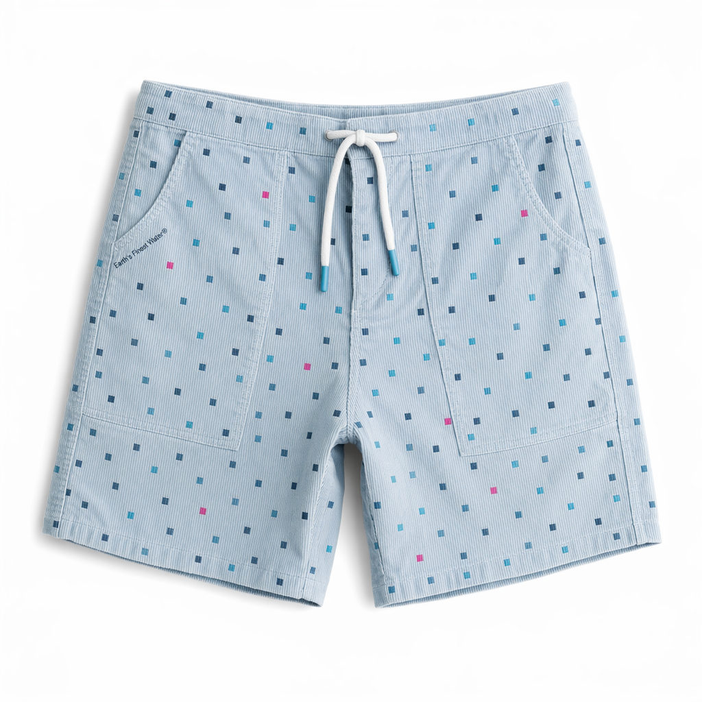 Photorealistic FIJI ‘square pool’ corduroy shorts, using silhouette 02_classic-corduroy-shorts-oregano.jpg as the exact cut. The corduroy is fine-wale and ultra-soft, base color light FIJI blue (#BBDDE6). All over, tonal jacquard-style print of small, lightly raised squares inspired by the FIJI bottle shape, some filled with deeper navy (#041C2C), others with bright light blue (#00C1D5), and an occasional magenta (#E10098) square as a playful accent. Pattern is subtle, premium, like a texture you notice up close. On the left leg, near the pocket opening, a minimal line of text in tiny, clean sans-serif: “Earth’s Finest Water®” in navy. White drawcord at the waistband with matching blue aglets. Lit with clean white studio lighting, slight gloss on the raised squares to show texture. Background is solid matte white, with a soft shadow falling behind and below the shorts. Camera is front-on, waist to just below the hem, slightly zoomed in to emphasize the pattern and texture, no model. Gen Z fashion lens: looks like a collab short you’d see on an upmarket streetwear drop, but relaxed and beach-ready.