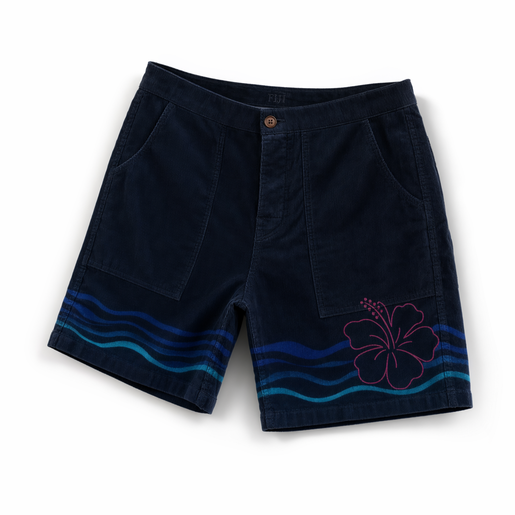 Photorealistic mockup of FIJI ‘hibiscus ripple’ corduroy shorts in the silhouette 02_classic-corduroy-shorts-oregano.jpg. Render the shorts in a deep navy (#041C2C) fine-wale corduroy with a smooth, luxe finish. Across the lower third of the legs, create a soft, irregular wave pattern in FIJI blues (#003DA5 and #00C1D5) mimicking gentle water ripples. Overlapping that on one side, a single stylized hibiscus outline in magenta (#E10098), minimalist and line-based, almost like a tattoo, not a big floral print. The FIJI logo appears only as a tiny tonal embroidery in navy on navy at the back waistband, barely visible, for a discreet premium touch. Lighting is soft, directional from upper right, creating gentle shadows in the corduroy ribs and subtle sheen on the waves. Clean white background; shorts are centered and slightly angled to reveal one side seam and a hint of back waistband. Shot is mid-distance, full garment visible with a mild depth of field blur on the background. Overall mood: calm, well-traveled, beach-after-golf relaxation—understated but distinctively FIJI.