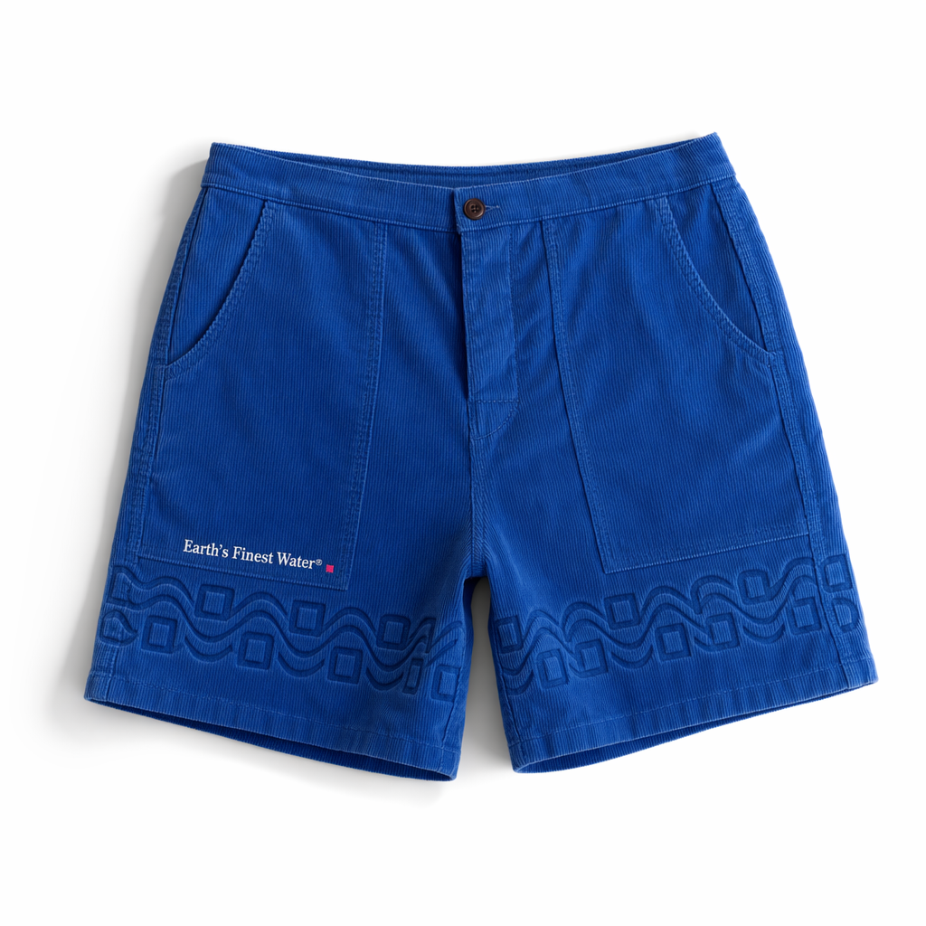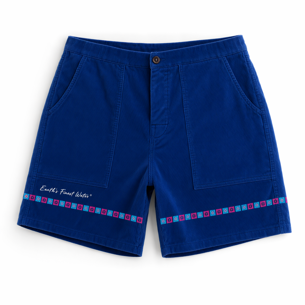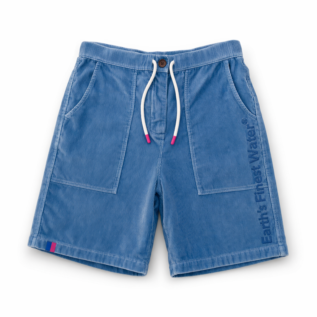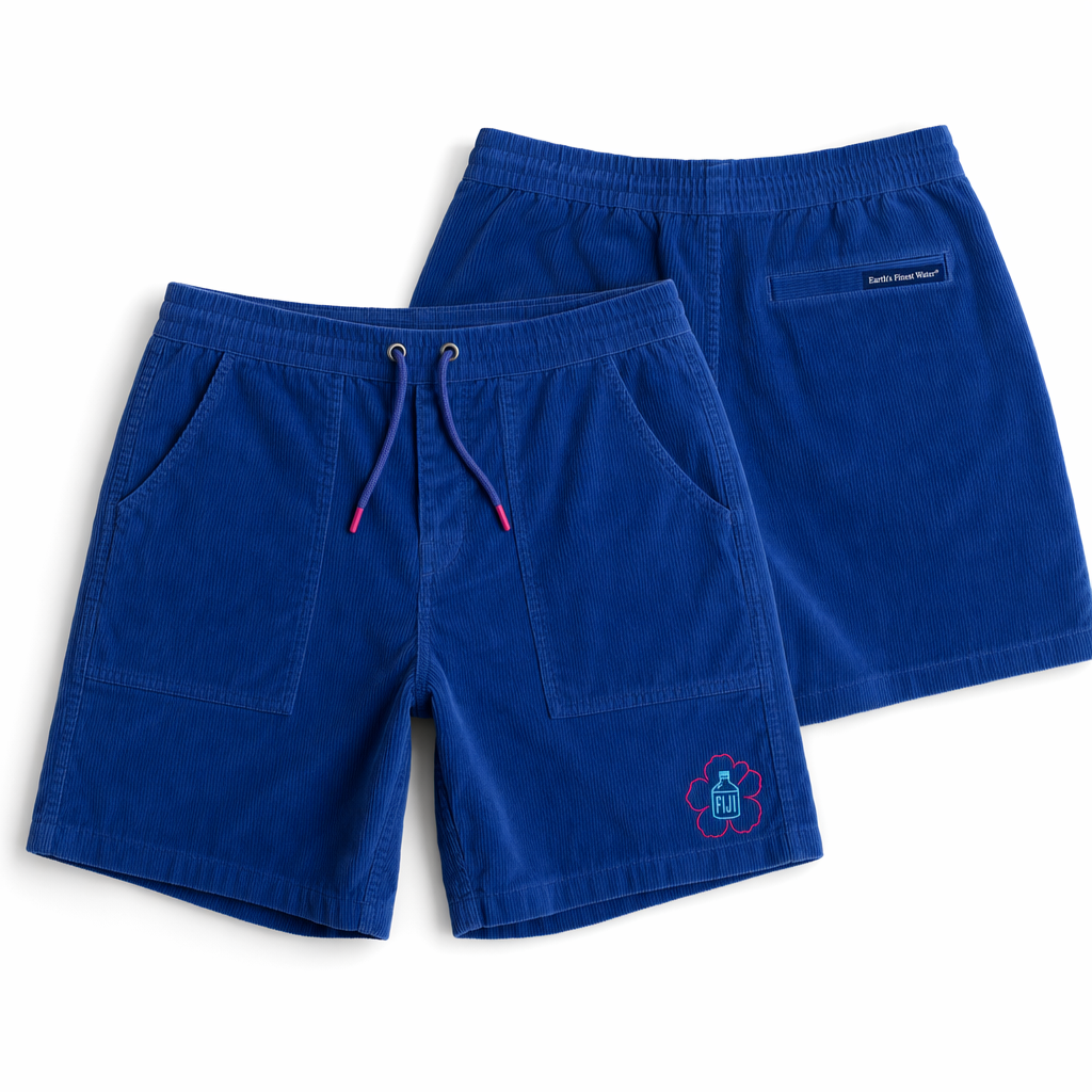 Photorealistic FIJI ‘everyday ritual’ corduroy lounge shorts using silhouette 02_classic-corduroy-shorts-oregano.jpg. Fabric is ultra-soft, washed corduroy with medium wale, in a slightly desaturated FIJI blue (#005EB8 cap blue reference, tuned for fabric) with a sun-faded effect along the seams for a vintage, lived-in vibe. On the left leg vertically near the side seam, tone-on-tone puff print text in slightly darker blue: “Earth’s Finest Water®” in a clean, condensed font. At the hem of the opposite leg, a micro woven label with a split-color design: half FIJI blue (#003DA5), half hibiscus magenta (#E10098). White, flat cotton drawcord with small magenta-dipped tips. Lighting is bright and even, emphasizing the softness and micro-fades in the fabric without harsh contrast. Background is solid white, with a discrete grounded shadow beneath the shorts to avoid a floating look. Camera close enough to clearly show the puff print and label, framed waist to just below hem, straight-on, no model. Gen Z cozy-core: looks like the shorts you reach for every morning for your ‘finest moments’ coffee and hydration ritual.