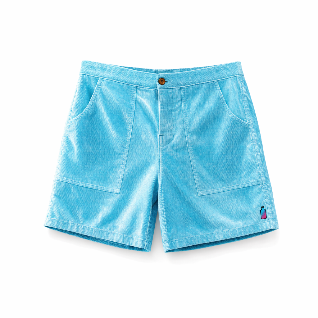 Photorealistic mockup of FIJI ‘glass reflection’ corduroy shorts, silhouette from 02_classic-corduroy-shorts-oregano.jpg. Short remains the same cut but is rendered in a glossy, almost velour-like fine-wale corduroy that catches light like water. Base color is bright light blue (#00C1D5), with subtle vertical highlights and lowlights to mimic the way sunlight plays through the FIJI bottle. Along one hem, a small, clean graphic: a simplified square bottle outline in navy (#041C2C) filled with a gradient from FIJI blue (#003DA5) to magenta (#E10098), very small and centered near the side seam. The phrase “your finest moments” is micro-printed in navy just below the back waistband. Lighting is high-key, almost e-commerce style, coming from multiple soft sources to create gentle gleams on the corduroy ridges, with faint specular highlights. Background pure white, no props, subtle shadow under the shorts only. Camera angle is slightly lower, looking up a bit at the garment to give it presence, full short in frame, no mannequin. Feels like a luxe poolside short designed for content creation days, not gym days.