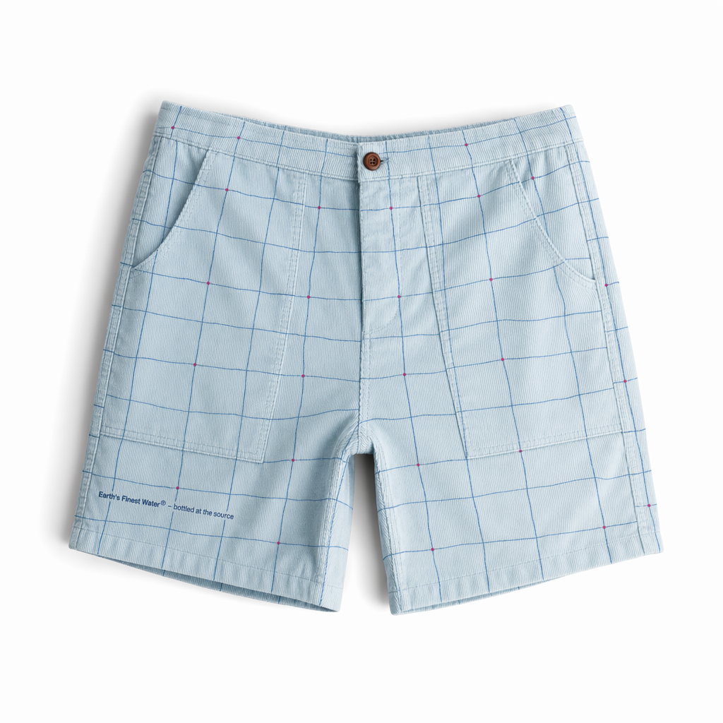Photorealistic FIJI ‘island grid’ corduroy shorts using the exact silhouette of 02_classic-corduroy-shorts-oregano.jpg. Fabric is structured but soft corduroy, medium wale, in a light blue base (#BBDDE6). Overlaid is a thin, irregular grid pattern referencing maps and resort tiles, drawn in FIJI blue (#003DA5); at every sixth intersection, a tiny magenta (#E10098) dot appears like a playful waypoint. On the front left leg, above the hem, a micro text label in navy reads: “Earth’s Finest Water® – bottled at the source”. The grid is subtle enough not to feel busy, readable up close. Waistband is elastic with a hidden interior drawstring to keep the top clean. Lighting is diffused daylight-white, slightly cooler to emphasize the crispness of the grid and the fresh, aquatic palette. Background is pure matte white, with a soft, elongated shadow cast behind the shorts for depth. Camera straight-on with slight tilt to show a bit of side seam; crop from waistband to just below hem to keep pattern clearly visible. Feels like something a Gen Z traveler would wear on a city-to-beach day, calm and design-forward.