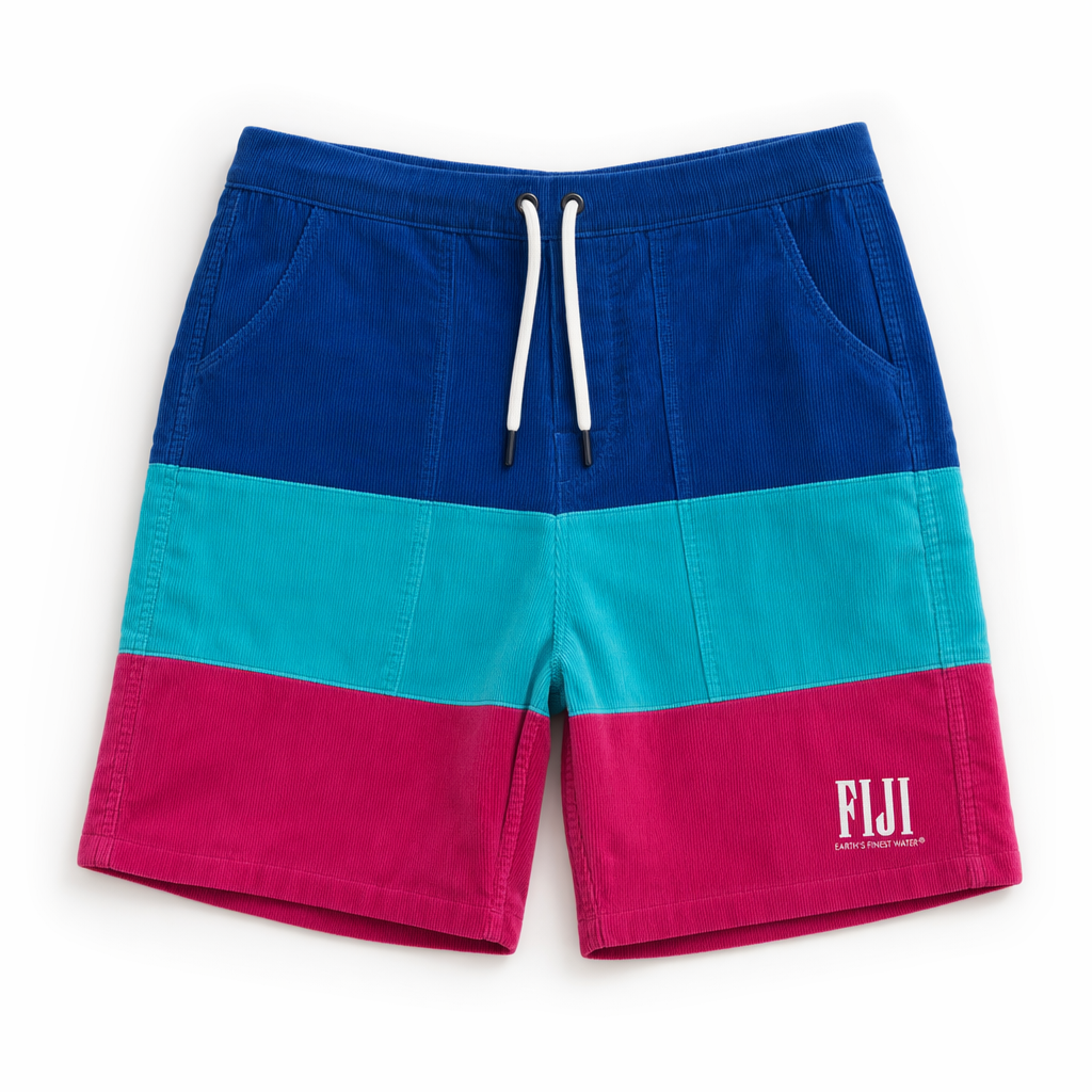 Photorealistic mockup of FIJI ‘capsule collab’ corduroy shorts using silhouette 02_classic-corduroy-shorts-oregano.jpg. Shorts are color-blocked horizontally: waistband and upper third in deep FIJI blue (#003DA5), middle band in bright aqua (#00C1D5), and lower third including hem in hibiscus magenta (#E10098), all in fine-wale corduroy with a soft hand. Seam transitions are razor-clean, with precise stitching visible at each color break. On the lower left leg, place a small, centered, white FIJI logotype plus the line “Earth’s Finest Water®” beneath in tiny caps, both screen-printed with a matte finish so it gently contrasts the plush cord. White flat drawcord exits via eyelets at the center front waistband, with navy (#041C2C) metal tips. Lighting is balanced studio white, slightly warmer to keep magenta rich and blues vibrant, creating delicate shadows in the wale texture. Background is pure white with a mild vignette, shorts perfectly centered and shot from straight-on at mid distance to fully show the color blocking. Overall vibe: drop-worthy, shareable, but still approachable and meant to be worn daily.
