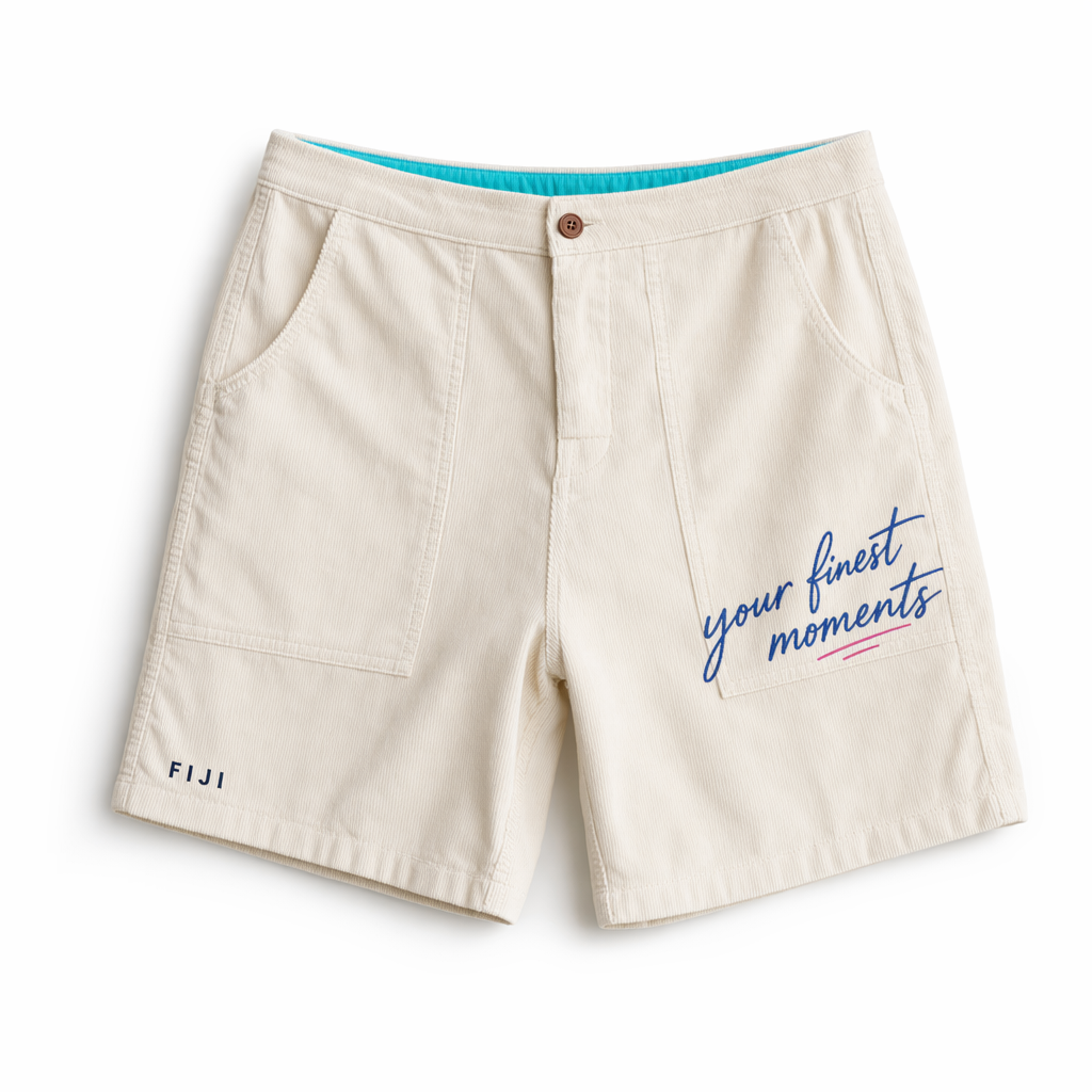 Photorealistic FIJI ‘chill script’ corduroy shorts, keeping the exact silhouette from 02_classic-corduroy-shorts-oregano.jpg. Fabric is a creamy off-white corduroy (very light ivory) with fine wale, intentionally chosen so the FIJI palette pops. Across the right thigh, slightly angled, is a hand-drawn script in FIJI blue (#003DA5) reading “your finest moments”, with a tiny magenta (#E10098) underline swoosh that echoes a water ripple. On the left lower hem, a minimal FIJI wordmark in small navy (#041C2C) block letters. Inside the waistband, visible at the top edge, a narrow strip of printed lining peeks out in bright aqua (#00C1D5), hinting at the brand without being loud. Lighting is soft and slightly warm to keep the off-white from feeling clinical, yet bright enough to maintain a clean, Gen Z-friendly e-comm feel. Background is solid white with a subtle soft shadow directly underneath. Framing is close-up from mid-waist to just below hem, slightly angled to hero the script. Short looks like a go-to piece for slow mornings and sunset beach walks, not performance sports.