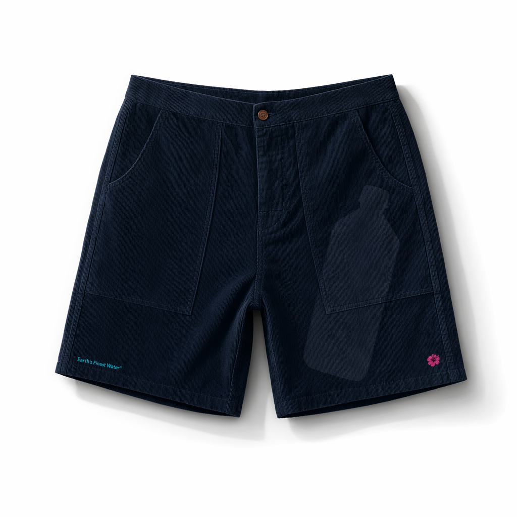 Photorealistic mockup of FIJI ‘bottle shadow’ corduroy shorts using the silhouette from 02_classic-corduroy-shorts-oregano.jpg. Render in deep navy (#041C2C) corduroy with slightly wider wale and a matte, dense hand to feel premium. On the right leg, use a subtle tonal shadow-print effect to depict the iconic FIJI square bottle silhouette enlarged and rotated slightly, in a very dark blue barely lighter than the base, almost like you’re seeing it as a shadow across the fabric. At the base of this shadow bottle, place a tiny magenta (#E10098) hibiscus icon. At the left hem, micro text in light FIJI blue (#00C1D5) reads “Earth’s Finest Water®”. Lighting is directional from the left, creating defined but soft shadows in the wales and making the shadow-print bottle emerge only when light hits at certain angles. Background is pure white to contrast the deep navy, with a strong but soft-edged cast shadow under and to the right of the shorts. Camera is a straight-on view with a slight downward angle, full shorts visible, emphasizing the graphic while keeping the overall look minimal and quietly flexy. Feels collectible but easy to wear with anything, sitting firmly in the FIJI relaxation and escape territory.