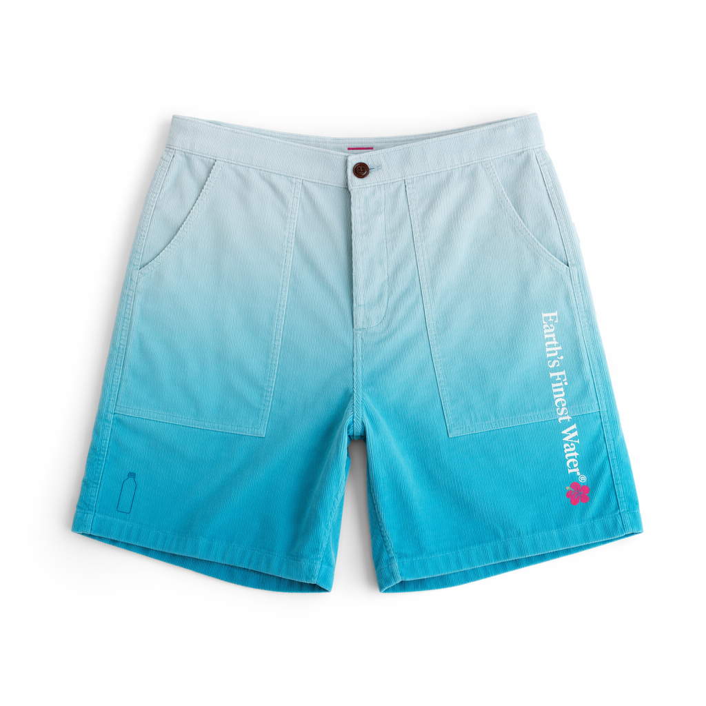 Photorealistic flat-lay mockup of FIJI-inspired corduroy shorts using the given silhouette. Fabric is ultra-soft, fine-wale corduroy dyed in a gradient from light FIJI ice blue (#BBDDE6) at the waistband to bright light blue (#00C1D5) at the hem, echoing the FIJI bottle water gradient. On the right leg, a playful but minimal vertical wordmark reads “Earth’s Finest Water®” in clean white type, with a small magenta (#E10098) hibiscus icon at the end for a pop of color. Left leg features a tiny tonal square outline hinting at the FIJI bottle shape, printed in slightly darker blue for a low-key flex. The waistband is elastic with a flat, modern profile, plus a slim magenta bar-tack detail at the center front. Shot on pure white seamless background, high-key lighting with very soft shadows to highlight the gradient and corduroy ridges. Camera is directly overhead, shorts centered with legs slightly angled apart to suggest ease and movement, aiming at Gen Z streetwear aesthetics with a calm, resort-like mood.