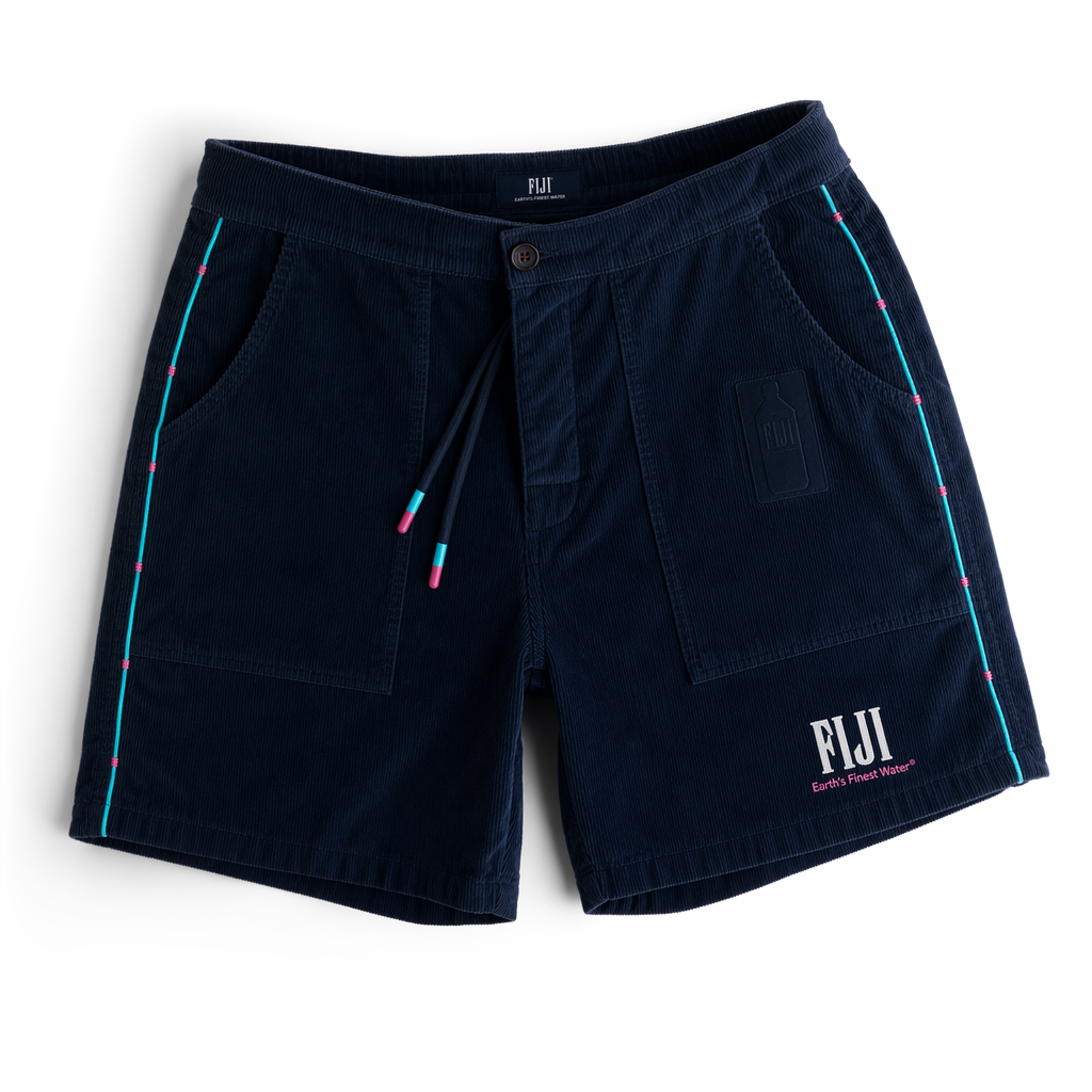 Photorealistic image of premium corduroy lounge shorts designed from the provided silhouette, targeting Gen Z. The shorts are in deep navy (#041C2C) fine-wale corduroy with a subtle sheen. Along the outer side seam of each leg runs a thin contrasting piping in FIJI bright blue (#00C1D5) with a tiny repeating hibiscus magenta stitch every few inches, like understated beads of color. On the lower front left leg, a minimalist stacked logo reads “FIJI” in white with “Earth’s Finest Water®” beneath in small magenta text, screen-printed with a soft-hand, matte finish. Back right features a square, tonal embossed patch echoing the FIJI bottle silhouette. Elastic waistband with a clean finish and hidden drawcord; cord tips are dipped half blue, half magenta for a playful but quiet detail. Shot on pure white studio backdrop, soft directional lighting from the right creating gentle lengthwise shadows that showcase the corduroy ribs and side piping. Camera angle is top-down, tight crop around the shorts, with a slight twist in the waistband to feel effortless and relaxed.