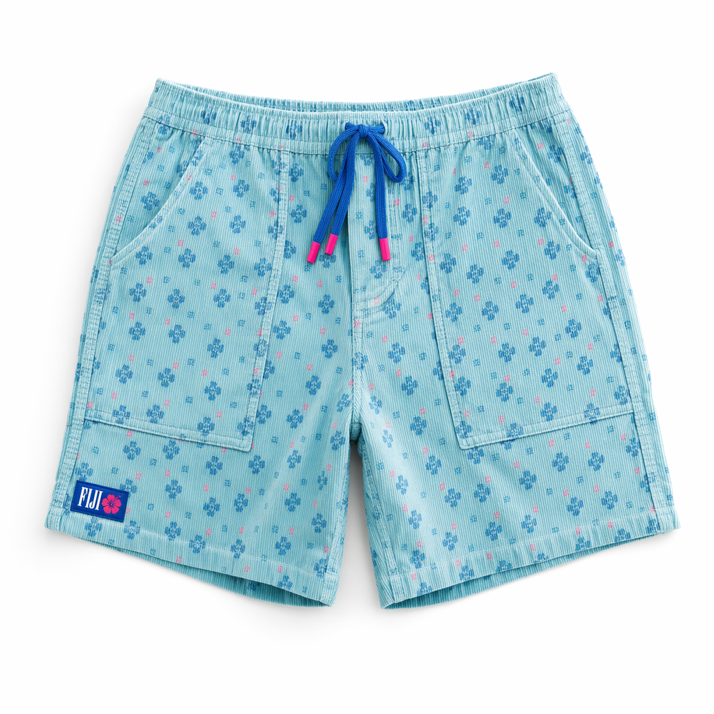 Photorealistic mockup of FIJI “island lounge” corduroy shorts using the exact silhouette shape. Fabric is ultra-soft corduroy in a sun-faded turquoise base (between #00C1D5 and #BBDDE6) with an allover micro-pattern of tiny hibiscus flowers and squares in tonal blue and a few scattered magenta (#E10098) pops, printed so that the pattern nestles between the cord ridges. The scale is small and sophisticated, like premium resort shorts, not loud. On the left hem, a small woven label in FIJI blue (#003DA5) with white FIJI logo and a magenta hibiscus sits flush with the seam. Waistband is elastic with a slightly ruched look and a flat braided drawcord in FIJI blue, ends tipped magenta. Photographed flat on a pure white background, daylight-balanced softbox lighting from above, minimal contrast, with gentle shadows at the side seams and leg openings to show shape. Camera is overhead and slightly closer, filling most of frame with the shorts, giving a clean DTC brand feel that still feels playful and escape-oriented.