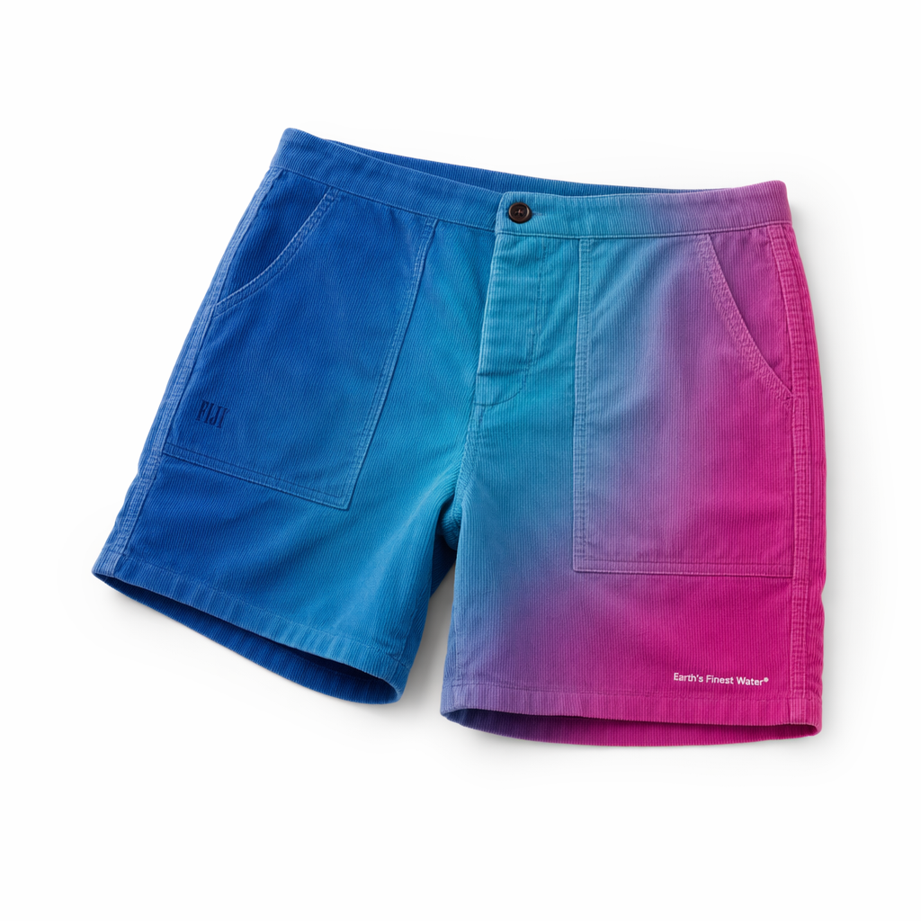 Photorealistic flat-lay of FIJI “sunset chill” corduroy shorts designed from the silhouette. Fabric is a soft cotton corduroy in a soft gradient that moves horizontally: left side leg in primary FIJI blue (#003DA5), blending through bright light blue (#00C1D5) to hibiscus magenta (#E10098) on the right outer edge, evoking a tropical sunset over water. Gradient is subtle and airbrushed, not harsh, with corduroy ribs still clearly visible. Minimal branding: a tiny tonal FIJI wordmark on the front left hip in darker blue, and “Earth’s Finest Water®” in very small white letters just above the right hem. Waistband is a clean elastic with a hidden internal drawcord, no visible ties for a sleek, fashion-forward Gen Z look. Shot on bright white seamless, with soft studio lighting from the top to keep colors rich and smooth; shadows are very soft, just enough to show the shorts’ volume and leg openings. Camera is overhead, with the shorts rotated a few degrees for an effortless, editorial flat-lay vibe suitable for social media stills.