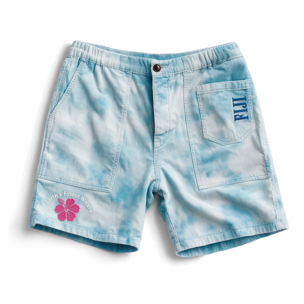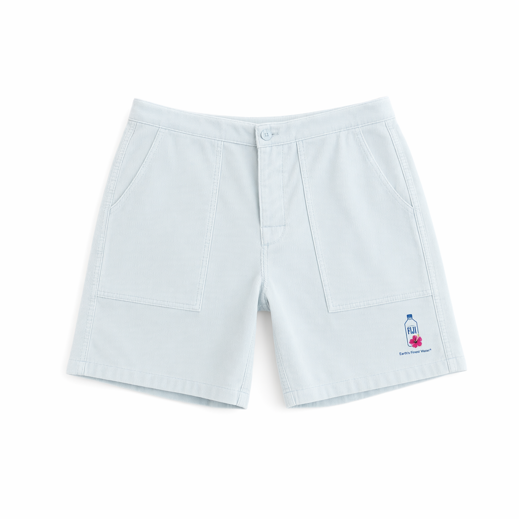 Gen Z-driven photorealistic render of FIJI “cloud wash” corduroy shorts, following the provided silhouette. Fabric is soft corduroy with a light blue (#BBDDE6) and bright light blue (#00C1D5) cloud-wash effect, reminiscent of sky reflections on water; the wash is subtle and organic, not distressed. On the front left leg, centered near the hem, is a small, crisp white arc of text saying “Earth’s Finest Water®” above a simple magenta (#E10098) hibiscus icon, printed with a slightly raised ink for tactile interest. Right back pocket (simple patch pocket) has a vertical FIJI logo in FIJI blue (#003DA5). Waistband is elastic with a slightly thicker, comfy profile; stitching is tonal. Shot on clean white backdrop with bright, soft daylight coming from upper left, creating soft edge shadows and mild specular highlights on the corduroy ridges. Camera is overhead, moderate distance, with the shorts lightly rumpled to feel effortless and lived-in, aligning with relaxed, everyday ritual vibes.