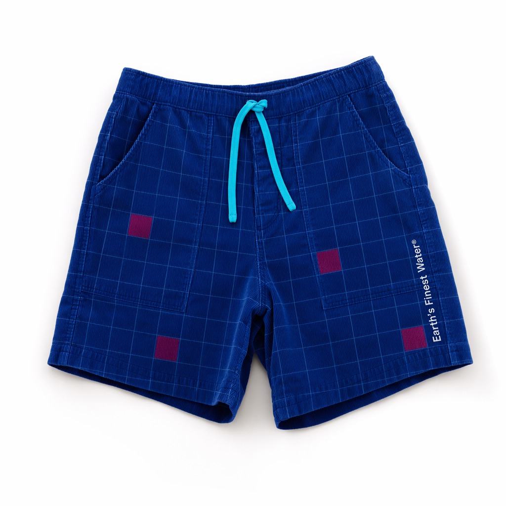 Photorealistic “pool tile” FIJI corduroy shorts using the given silhouette as the exact cut. Main fabric is deep FIJI blue (#003DA5) corduroy. The front panels feature a subtle allover grid print in slightly lighter blue, referencing pool tiles and the square bottle, with occasional tiles filled in hibiscus magenta (#E10098) as playful accents. Grid lines are thin and precise so the effect feels premium, like designer streetwear. On the lower right leg, the phrase “Earth’s Finest Water®” runs vertically in white, clean sans-serif, reading from hem toward waistband. Elastic waistband with a flat drawcord in bright light blue (#00C1D5), ends heat-sealed. Photographed flat on stark white seamless, with cool, diffused studio light that creates slim, crisp shadows along the leg edges and waistband to show structure. Camera is directly overhead, but the shorts are styled with one leg slightly overlapping the other to evoke relaxed, by-the-pool energy for Gen Z while still feeling elevated.