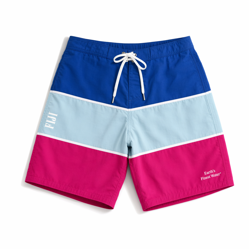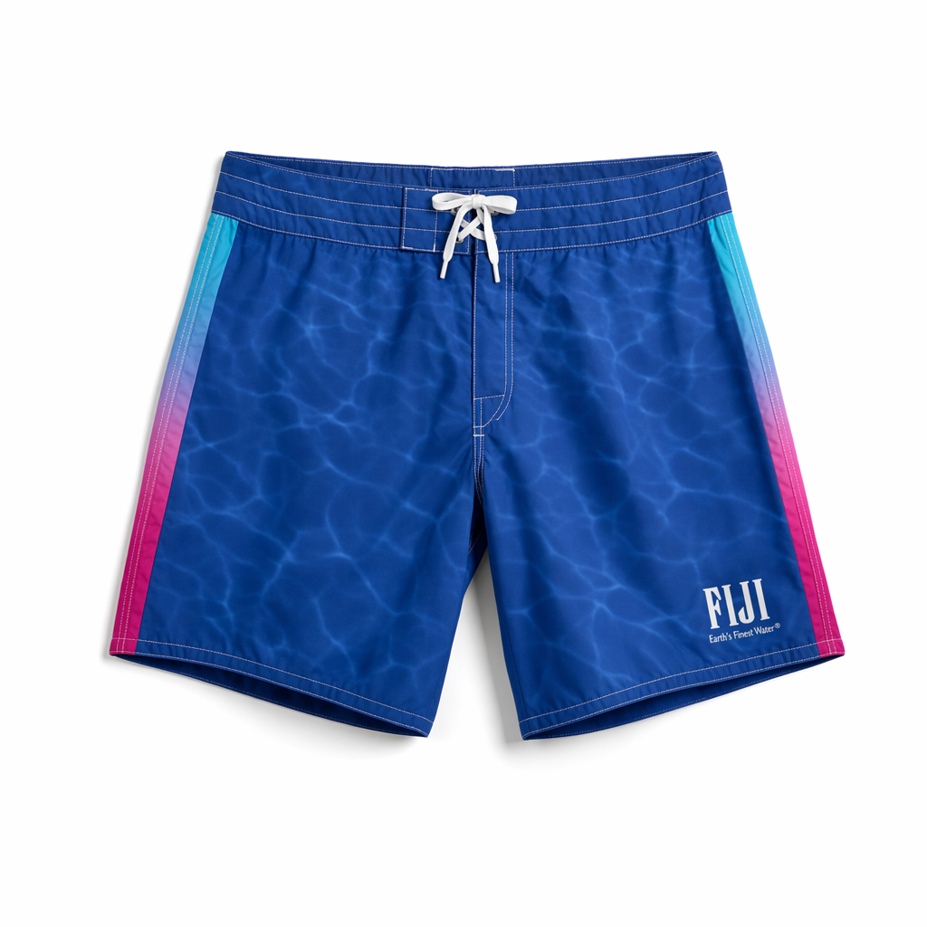 Photorealistic flat-lay of FIJI Water branded unisex boardshorts using the provided silhouette 04_310-boardshorts-dark-olive.jpg as the exact shape and cut. Smooth, quick-dry recycled polyester with a soft, slightly matte finish, mid-thigh length with elastic waistband and drawcord. Main body in rich FIJI primary blue (#003DA5) with a subtle tonal wave pattern suggesting water ripples. Side panels feature a vertical gradient stripe from bright light blue (#00C1D5) into hibiscus magenta (#E10098), echoing the FIJI bottle gradient. Small, clean FIJI logo and the line “Earth’s Finest Water®” printed in white on the lower hem, minimal and premium, no heavy branding. Gen Z-focused styling: modern, slightly boxy cut, no obvious surf logos. Shot on bright white seamless background, soft diffused studio lighting with gentle top-down shadows, camera directly overhead, full shorts centered in frame with a slight fabric drape for realism. High resolution, hyper-real textile detail, visible stitching and waistband texture.