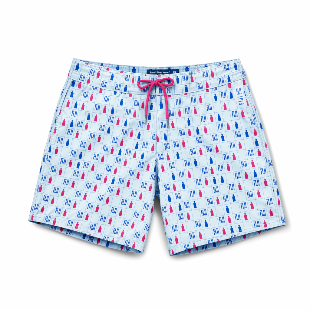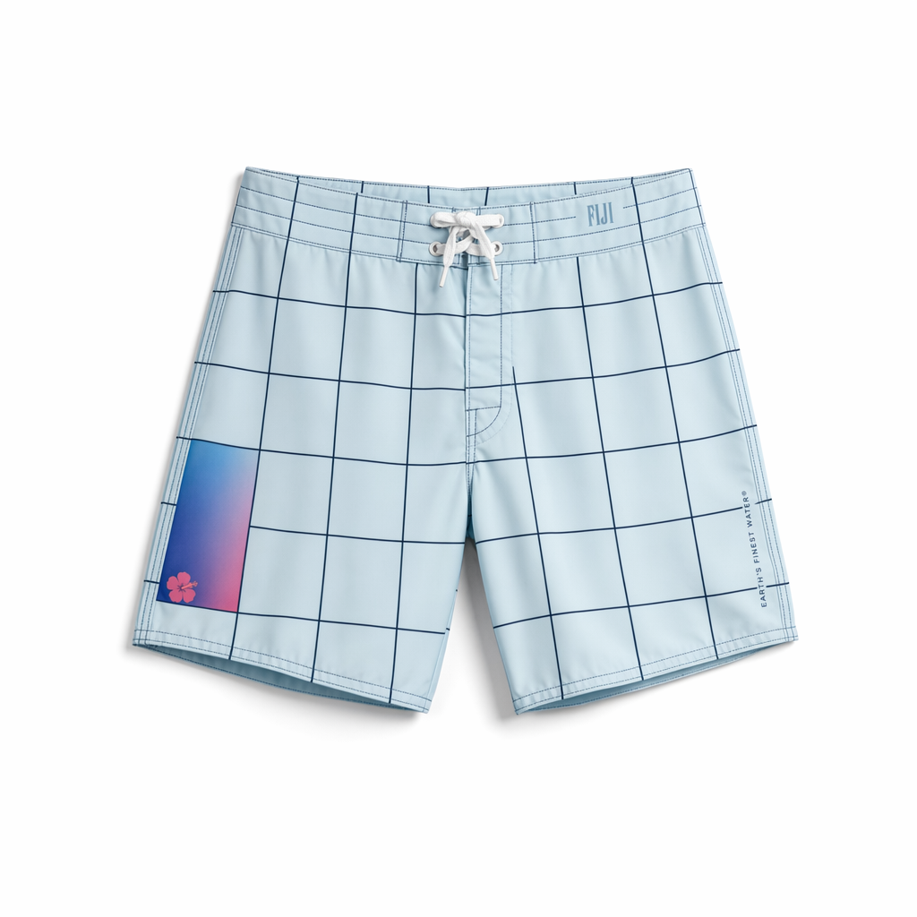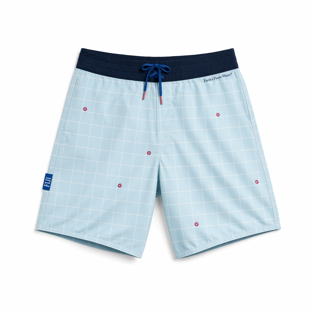 Photorealistic flat-lay of FIJI ‘island grid’ boardshorts using the exact silhouette shape, on a pure white background for an e-commerce-ready Gen Z aesthetic. Fabric is lightweight recycled nylon with a smooth, slightly satin-matte sheen. Base color is soft light blue (#BBDDE6). Overlaid is a subtle tonal grid of thin white lines forming squares, referencing FIJI’s iconic square bottle. Within a few squares, tiny hibiscus icons in magenta (#E10098) appear like easter eggs. The waistband is solid navy (#041C2C) with a hidden elastic and exposed FIJI blue (#003DA5) flat drawstring tipped in magenta. On the left leg, a small vertical woven label in FIJI blue with white FIJI logotype sits near the side seam; right back waistband has “Earth’s Finest Water®” printed in small navy type. Soft diffused overhead lighting ensures even illumination with natural fabric shadows. Camera is perfectly top-down, full short visible with a little white space around, no props, minimalist and premium.