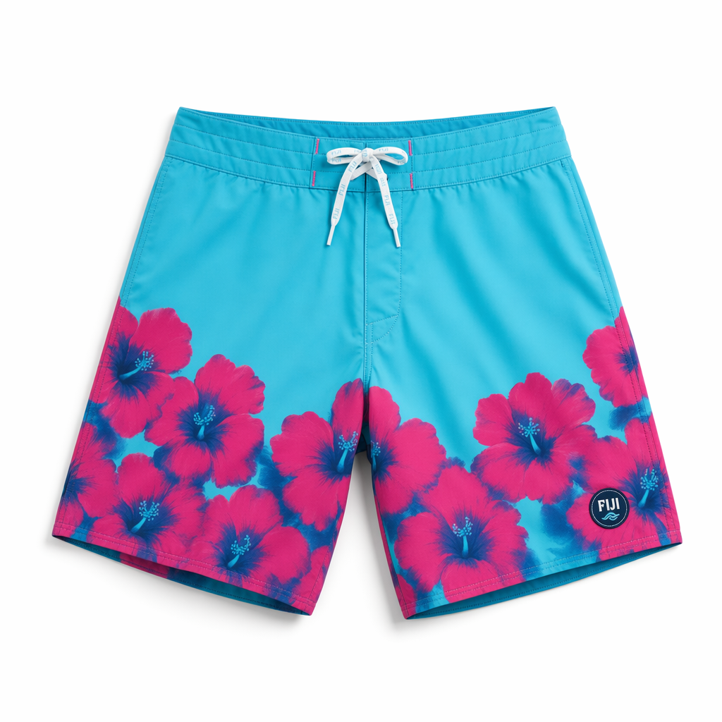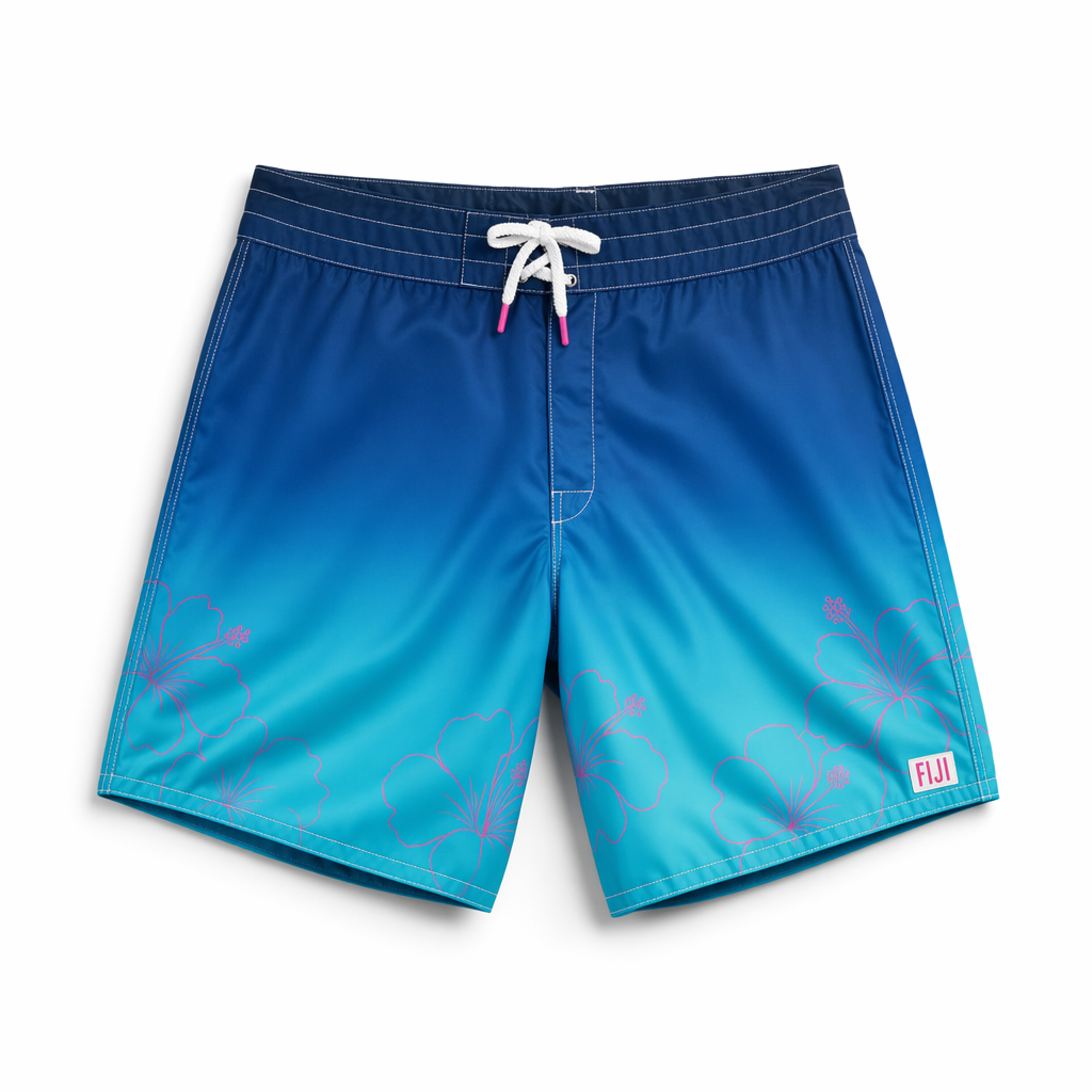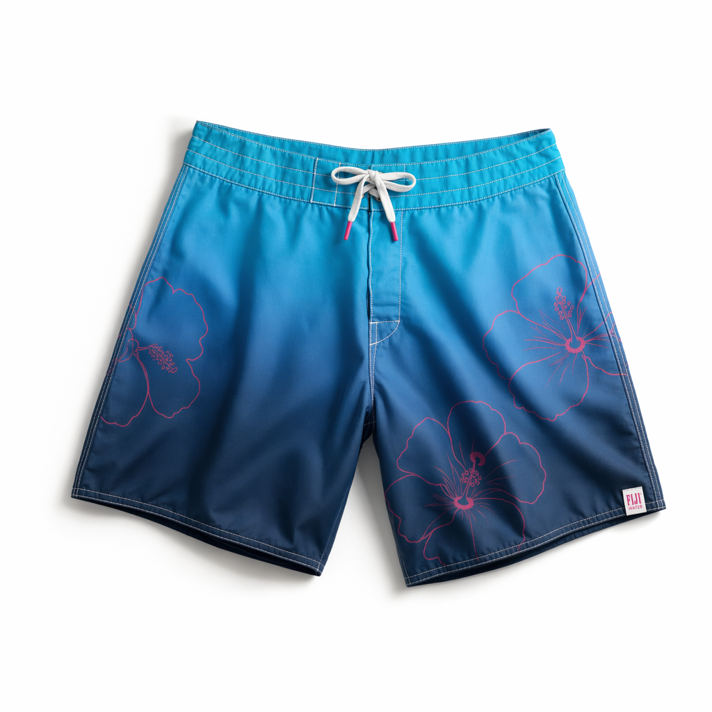 Photorealistic overhead shot of FIJI Water “Hibiscus Fade” boardshorts, silhouette strictly from 04_310-boardshorts-dark-olive.jpg. Soft, quick-dry fabric with a brushed matte finish that feels like elevated loungewear. Ombre color fade from FIJI electric blue at the waistband (#00C1D5) down to deep navy (#041C2C) at the hem, with sparse oversized line-art hibiscus flowers in magenta (#E10098) drifting diagonally across the legs, semi-transparent so the gradient shows through. Discreet FIJI logo tag stitched on the bottom hem in white and magenta, plus “Earth’s Finest Water®” printed very small on the back waistband. Drawcord tips in magenta for a playful accent. Gen Z vibe: effortless, resort-core, not loud. Shot on clean white backdrop with soft natural-leaning studio light from the left, creating gentle shadows and highlighting the gradient. Camera top-down, shorts slightly angled for depth, visible subtle wrinkles for realism, high-resolution textile and print detail.
