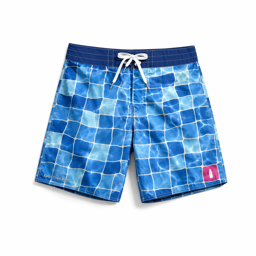 Photorealistic flat-lay of FIJI Water “Pool Tile” boardshorts using 04_310-boardshorts-dark-olive.jpg silhouette shape. Fabric is recycled poly with a cool-touch, slightly crisp texture, semi-matte. Allover print mimics sunlit pool tiles: irregular organic squares in varying tones of FIJI blues (#003DA5, #00C1D5, #BBDDE6) with soft white highlights, suggesting ripples. A single tile near the right hem is magenta (#E10098) with a tiny white FIJI bottle icon inside, acting as a quiet brand signature. Waistband solid navy with a white drawcord; “Earth’s Finest Water®” micro-embroidered in white on the front left leg just above the hem. Gen Z-friendly pattern: playful, photogenic, ideal for social content. Shot on bright white background, overhead camera, studio lighting with a slight directional angle to emphasize texture and the shine of ‘tile’ highlights, soft shadows beneath the shorts. Ultra-detailed print and stitching, realistic folds and volume.