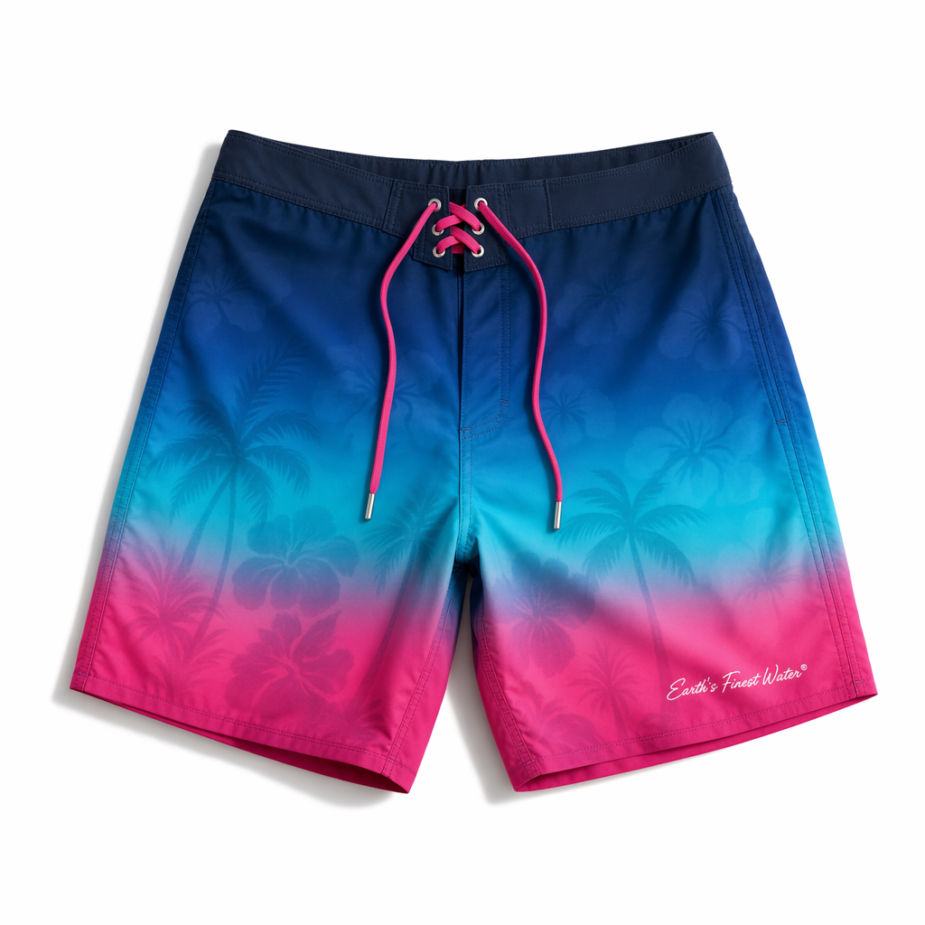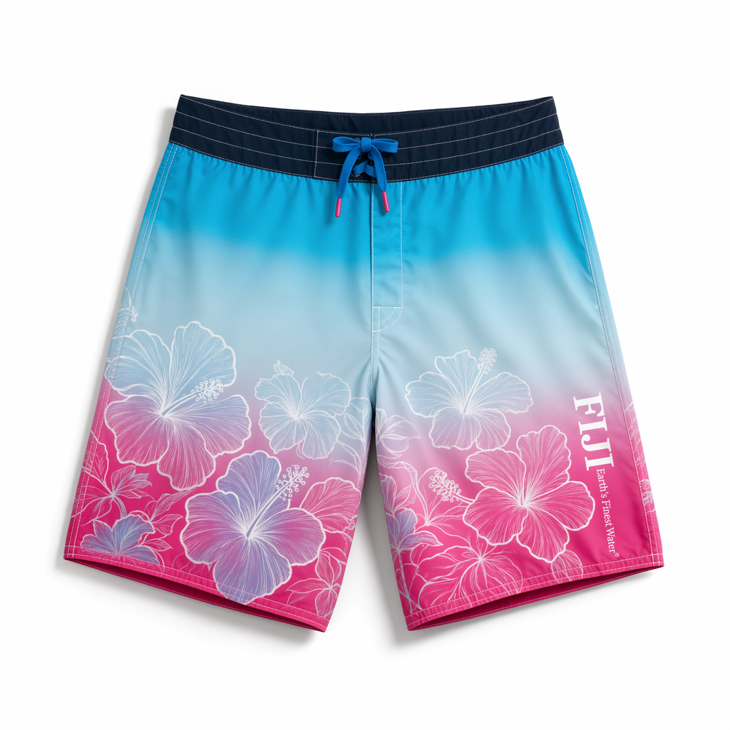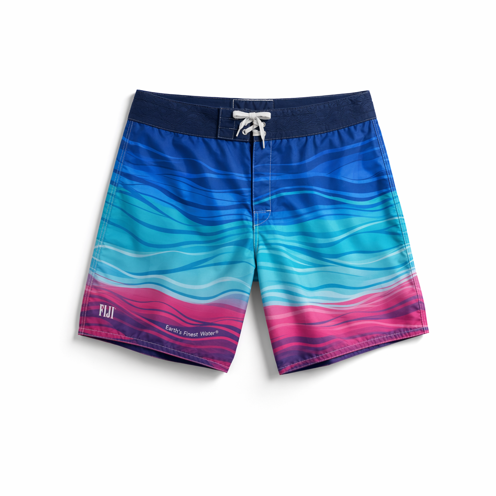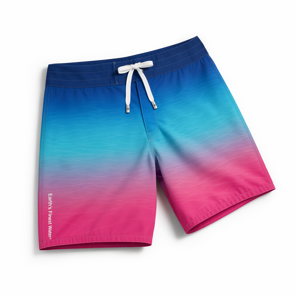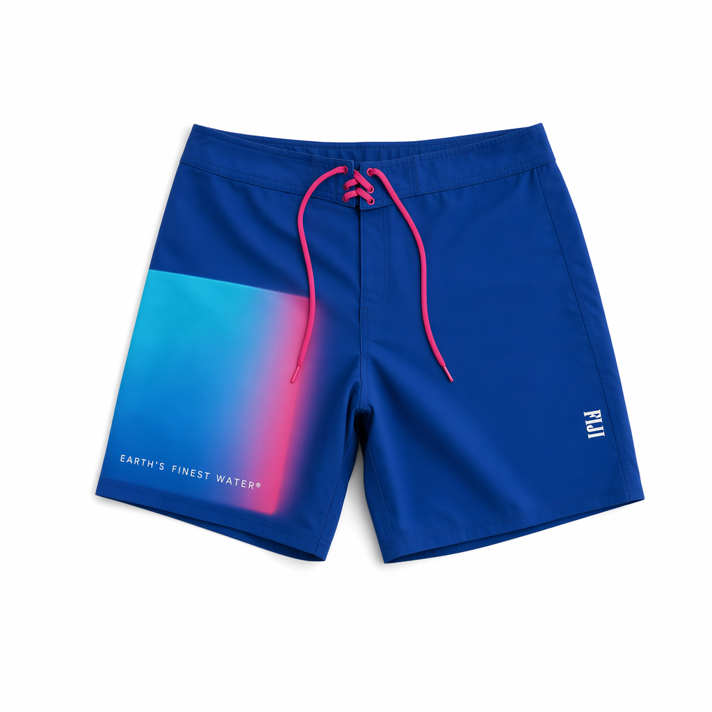 Photorealistic studio shot of FIJI boardshorts inspired by a sunset-over-water gradient, using the supplied silhouette form, on a crisp white seamless background. Fabric is buttery-soft recycled polyester with a brushed-microfiber feel, ultra-matte, no shine. The color transitions vertically from deep FIJI blue (#003DA5) at the waistband through bright light blue (#00C1D5) to hibiscus magenta (#E10098) at the hem, mimicking a tropical dusk sky reflected on water. Very faint, almost ghosted wave lines in a slightly lighter tint add depth without feeling busy. The waistband is solid navy with an internal elastic, white flat drawcord with small metal tips engraved with a tiny hibiscus icon. On the lower left leg, small clean white text reads “Earth’s Finest Water®” in a modern sans-serif, aligned vertically near the side seam. Soft, high-key lighting from front and top creates gentle shadows along the side seams and hem, emphasizing the gradient. Camera angle is top-down with a slight 10-degree perspective tilt for a more editorial Gen Z feel while still clearly showing the shape.