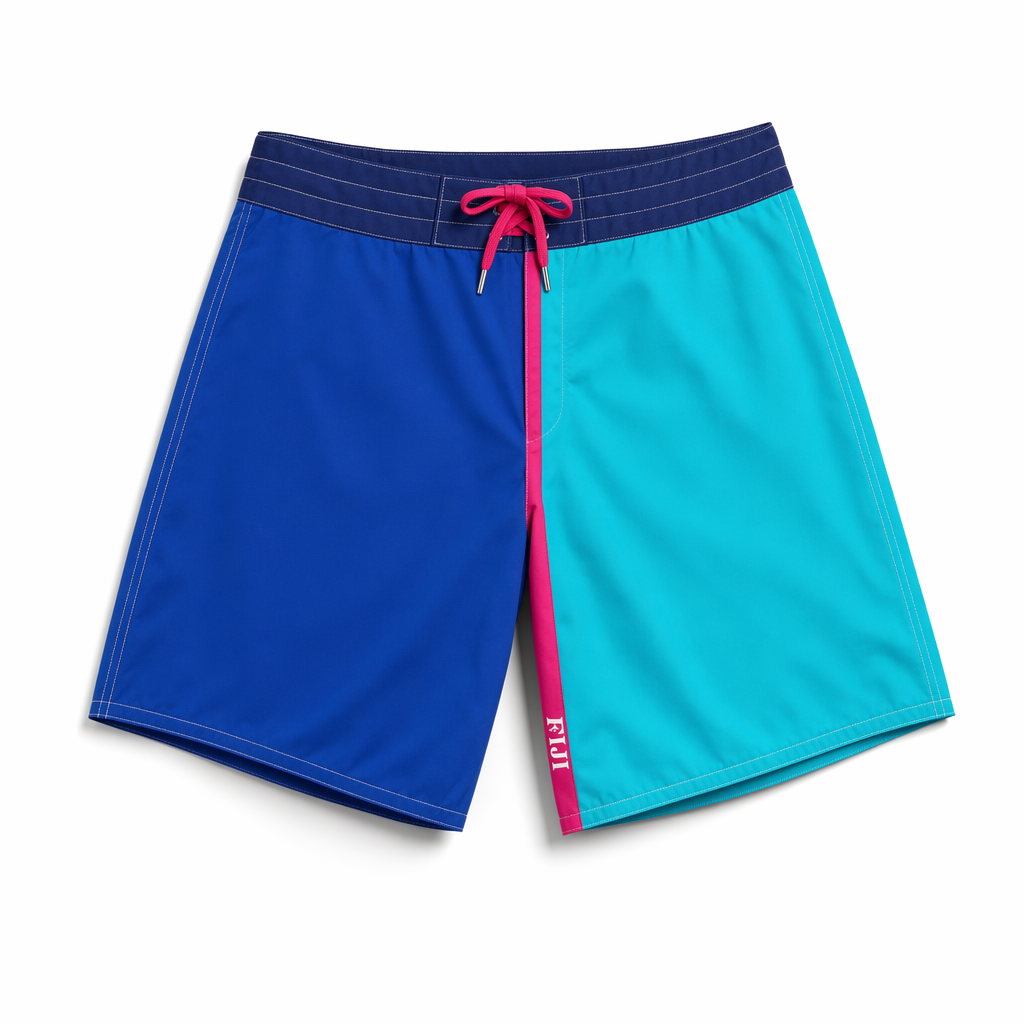 Photorealistic flat-lay product shot of FIJI Water “Split Tone” boardshorts, using 04_310-boardshorts-dark-olive.jpg as the exact shape. Clean color-blocked design: left leg in FIJI deep blue (#003DA5), right leg in bright aqua (#00C1D5), separated by a thin vertical magenta stripe (#E10098) running from waistband to hem at the front and back. Fabric is smooth quick-dry with a refined matte finish. Small vertically oriented FIJI logo in white within the magenta stripe near the lower front, plus “Earth’s Finest Water®” subtle tonal print along the back hem. Waistband navy with an internal magenta drawcord, visible tips. The look is minimalist but bold, appealing to Gen Z for its crisp, graphic style. Shot on pure white backdrop, strong but diffused overhead studio lighting, clear soft-edged shadow under the shorts for depth. Camera directly overhead, high-resolution, with visible weave, stitching, and sharp separation of color blocks.