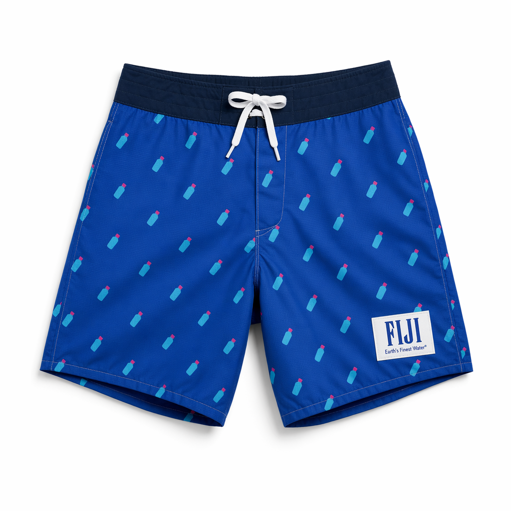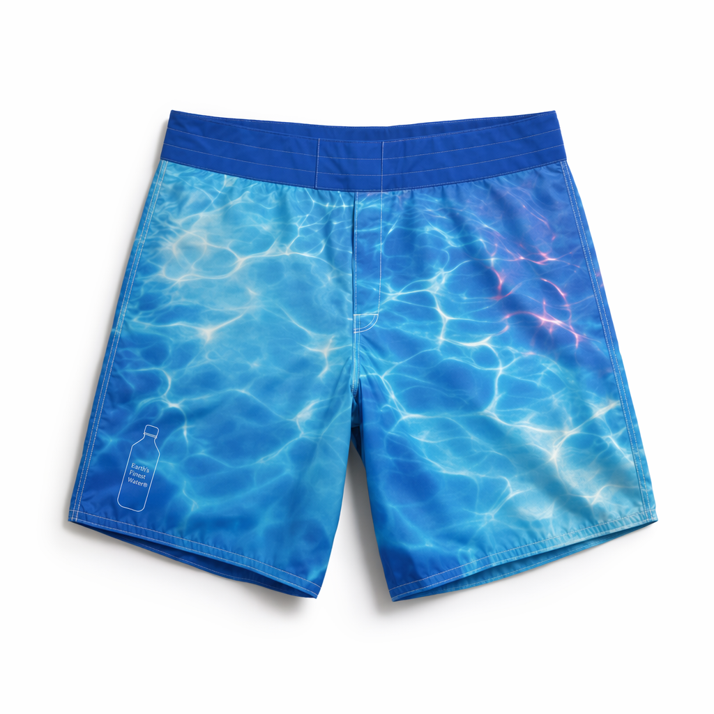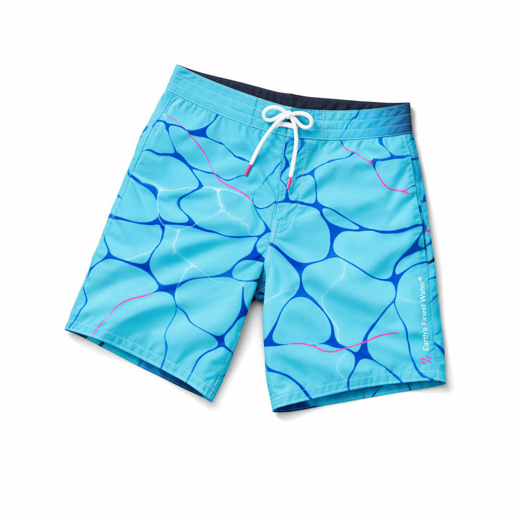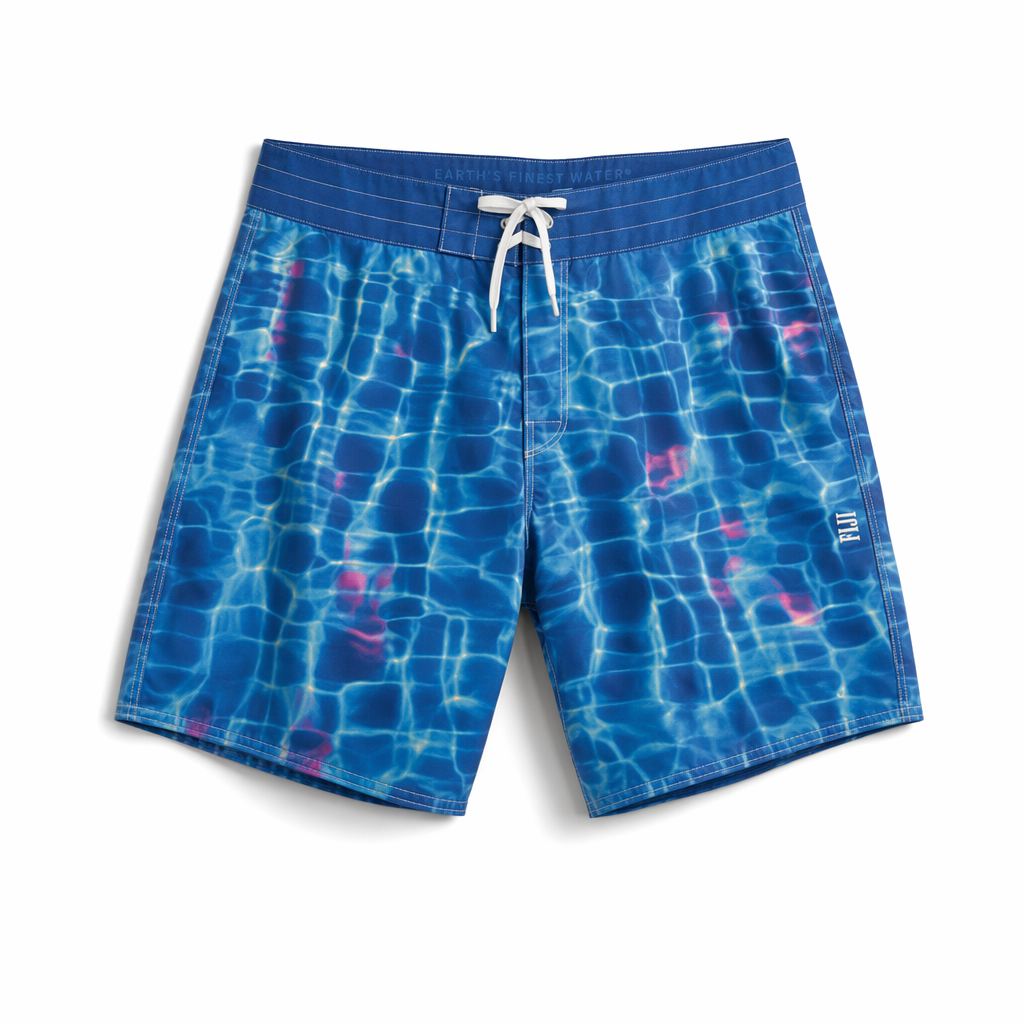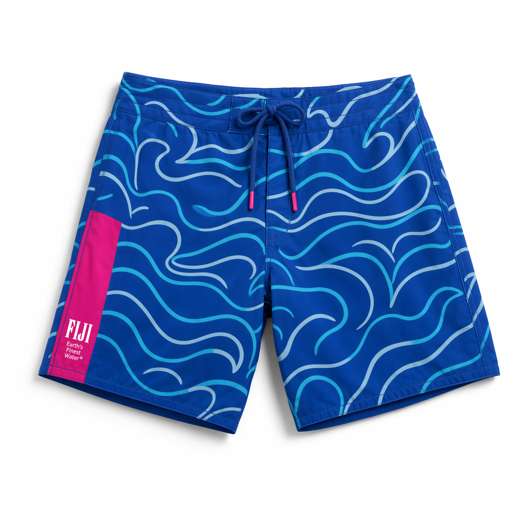 Photorealistic top-down shot of FIJI ‘glass ripple’ boardshorts, using the given silhouette as the exact template. Material: ultra-light recycled polyester with a slightly glossy, water-like finish, still premium. The print mimics looking into a clear Fijian lagoon: soft, fluid gradients of FIJI blues (#003DA5, #00C1D5, #BBDDE6) with faint sunlight caustic patterns, and rare, subtle streaks of magenta (#E10098) as if reflections from a hibiscus just out of frame. The branding is delicately integrated: an outline of the FIJI bottle in thin white lines on the lower left leg, with ‘Earth’s Finest Water®’ inside the outline in microtype; barely-there but visible up close, appealing to detail-oriented Gen Z. Waistband is clean FIJI blue, with hidden elastic and no visible drawcord for a sleek look. Shot on seamless pure white background, soft daylight-mimicking studio light from above with gentle gradient shadow beneath the shorts, minimal but premium aesthetic, no additional elements. Camera directly overhead, slightly zoomed in to capture the intricate water ripple effect and luxurious fabric surface.