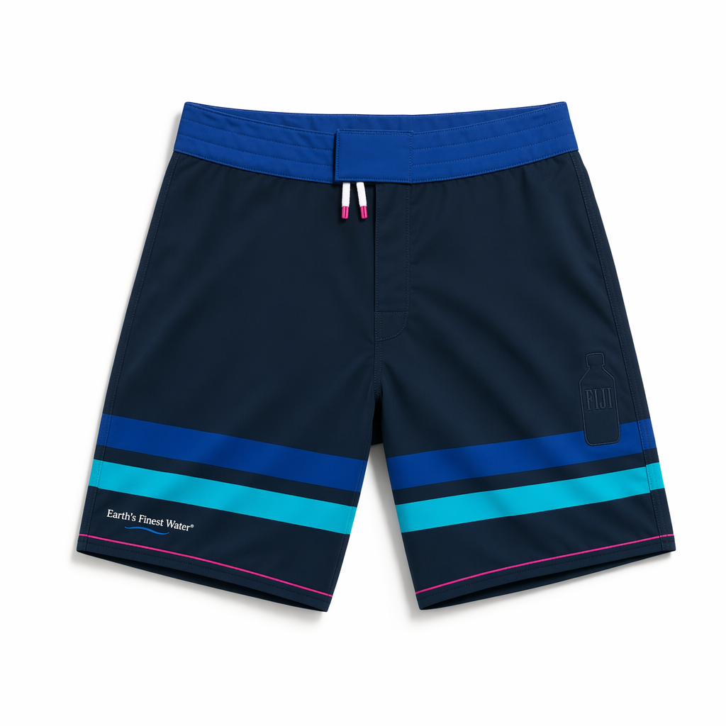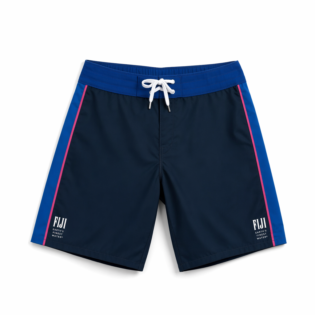 Photorealistic top-down shot of FIJI Water “Cap Stripe” boardshorts using silhouette 04_310-boardshorts-dark-olive.jpg. Design cues from FIJI’s iconic cap and label. Main body in rich navy (#041C2C) with a vertical side stripe at each outer seam: a wide band of cap blue (#005EB8) bordered by thin magenta (#E10098) pinstripes. Inside the stripe near the lower leg, a small stacked FIJI logo in white with “Earth’s Finest Water®” below in tiny uppercase. The waistband is FIJI primary blue (#003DA5) with a concealed elastic and an exposed white drawcord. Fabric is smooth, midweight quick-dry with a slight technical look, still refined. Overall style is sporty-relaxed but clearly lifestyle, not performance. Gen Z detail: color-blocked stripes, subtle brand storytelling through the cap reference. Placed on a pure white seamless surface, soft diffused overhead lighting with faint shadows, camera directly above, ultra-sharp focus showing stripe edges, stitching, and fabric texture.