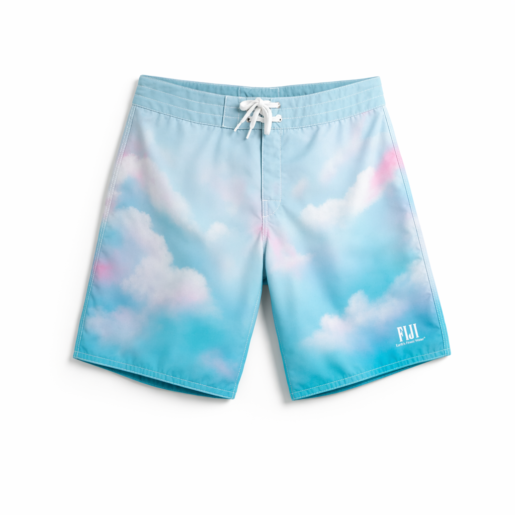 Photorealistic overhead product render of FIJI Water “Cloud Drift” boardshorts, silhouette matching 04_310-boardshorts-dark-olive.jpg exactly. Ultra-soft recycled microfibre with a luxurious matte finish, evoking lounge comfort. Background is a gradient from pale sky blue (#BBDDE6) at the top to soft aqua (#00C1D5) toward the hem. Over this, dreamy, lightly airbrushed cloud shapes in slightly lighter blues and whites, with occasional faint magenta (#E10098) glow at the edges, suggesting a tropical sunrise. The FIJI logo sits small and centered on the left leg in white, with “Earth’s Finest Water®” in a tiny line below it, also white. Waistband tonal aqua with hidden elastic, no visible branding except small stitched eyelets for the white drawcord. Gen Z appeal: soft, calming, aesthetic, very “escapism” and Instagrammable. Laid on a stark white background, softly lit from above with gentle, even shadows; camera top-down, capturing the dreamy print gradation and the tactile, premium fabric texture.