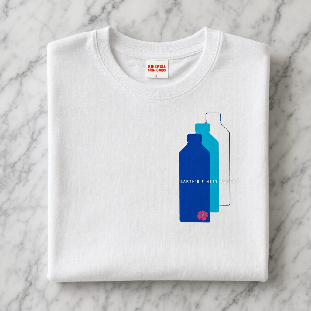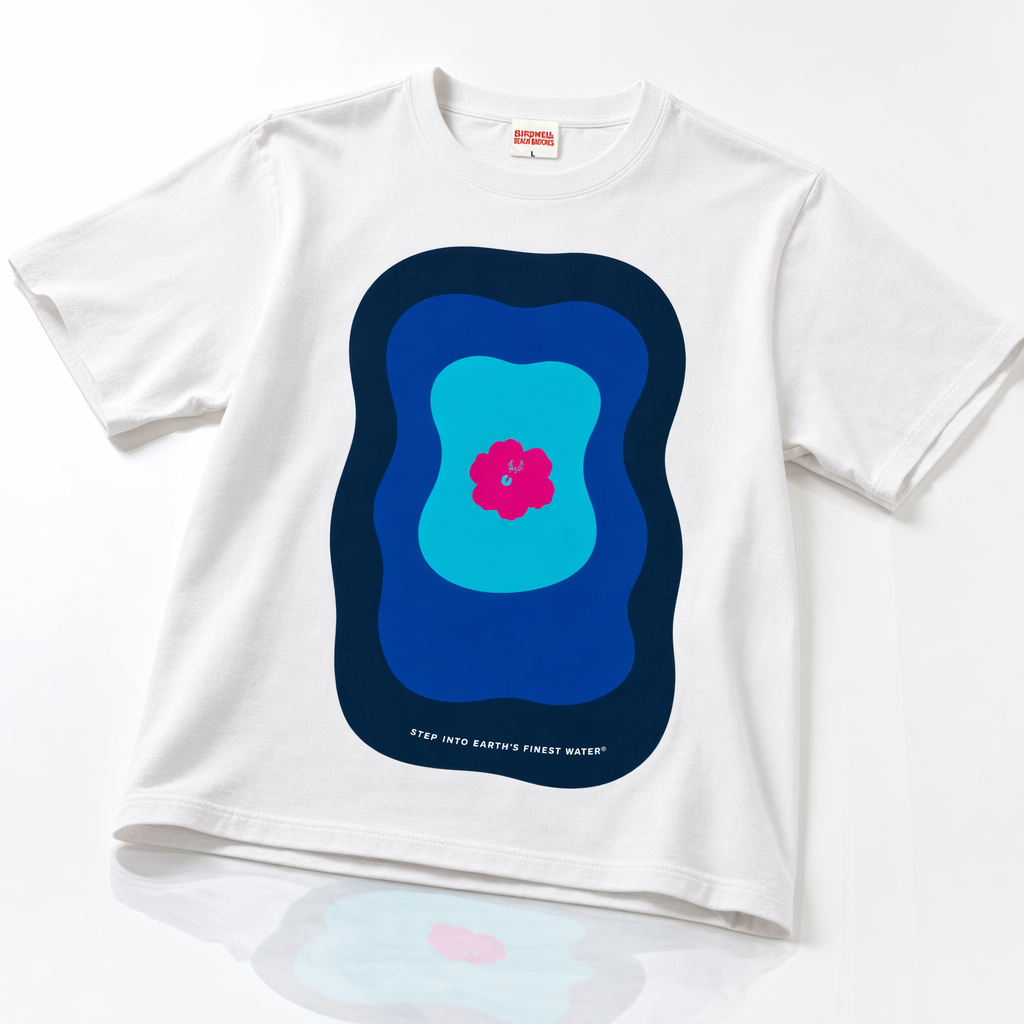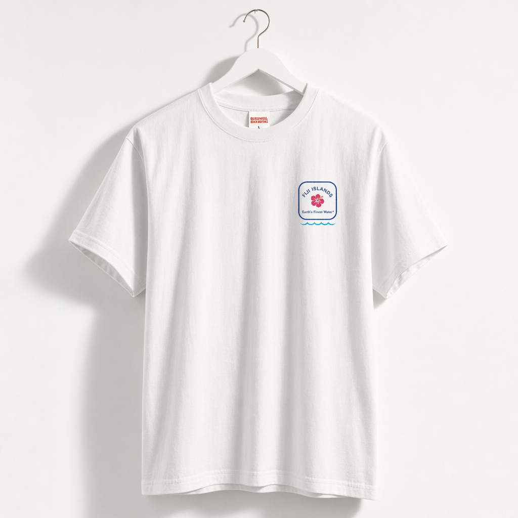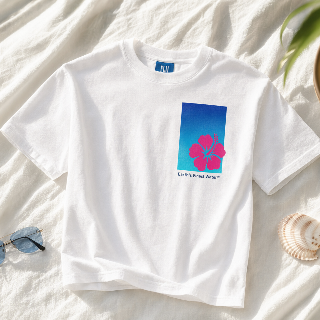 Photorealistic flat-lay mockup of a vintage white unisex t-shirt (use provided silhouette for shape) laid on a soft, lightly wrinkled white cotton sheet. Front graphic: a square, off-center toward the left chest, inspired by the iconic FIJI Water bottle shape. Inside the square, a vertical gradient from deep FIJI blue (#003DA5) at the top to bright light blue (#00C1D5) at the bottom, with a soft glow effect to feel like chilled water. In the lower third of the square, a single oversized hibiscus icon in rich magenta (#E10098), minimal and flat, no outlines. Below the square in small, clean sans-serif type: “Earth’s Finest Water®” in navy (#041C2C). Overall print style: screen-printed, slightly matte, not plasticky. T-shirt fabric looks thick, premium, slightly boxy and cropped (Gen Z streetwear fit), with a subtle high-quality neck tag peeking out in FIJI blue. Lighting: bright, natural daylight from top left, soft shadows, slightly overexposed whites for a sun-bleached, coastal mood. Add a few laid-back props around the shirt edges partially cropped out of frame: a pair of small rimless sunglasses with light blue lenses and a single shell, all in soft focus to keep the shirt graphic hero. Camera: overhead top-down shot, medium distance, sharp focus on chest graphic area, shallow depth of field on props.
