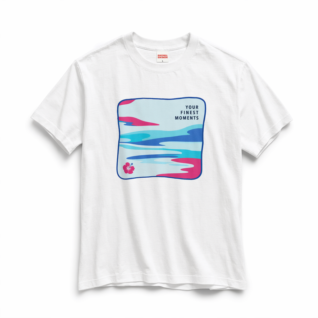 Photorealistic mockup of a vintage white unisex t-shirt (use provided silhouette for shape) lying on a seamless white backdrop, styled like a clean e-commerce product but with a fashion edge. Center chest graphic: a playful, slightly warped square frame echoing the FIJI bottle silhouette, outlined in FIJI blue (#003DA5). Inside, an abstract, dreamy “liquid landscape”: soft, wavy bands of light blue (#BBDDE6), bright turquoise (#00C1D5), and hints of magenta (#E10098) like a sunset reflecting on water. Overlaid in the upper right corner of the square in small, confident uppercase text: “YOUR FINEST MOMENTS” in navy (#041C2C). On the lower left of the square, a tiny magenta hibiscus stamp, minimal and graphic, like a subtle designer logo. Print finish: high-end DTG or water-based ink, sitting flat in the fabric for a vintage feel. The tee is styled with relaxed sleeves and a slight crop, collar crisp and substantial to signal quality. Lighting: soft studio lighting with a cool temperature, faint shadow under the shirt to create depth but keep the background nearly pure white. Camera: straight-on overhead shot, framed to show the full t-shirt with extra white space around for social media cropping.