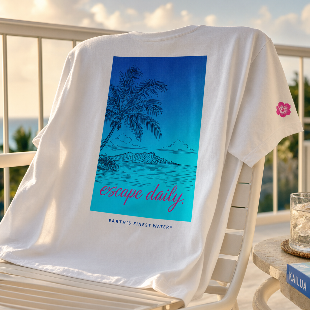 Photorealistic lifestyle mockup of a vintage white t-shirt (use provided silhouette) draped casually over the back of a white outdoor lounge chair on a sunlit balcony. Focus on the back of the t-shirt. Large back graphic: a vertically oriented rectangle in FIJI blue gradient (top: #003DA5 fading into #00C1D5), echoing the FIJI bottle label. Centered inside, a stylized line-art illustration of a Fijian island horizon: palm fronds and a calm ocean line in thin navy (#041C2C) strokes. At the bottom of the rectangle, in magenta (#E10098) cursive: “escape daily.” Beneath the rectangle in small uppercase sans-serif: “Earth’s Finest Water®” in FIJI blue. On the front chest (just barely visible on the chair), a tiny magenta hibiscus icon over the heart. Fabric is soft, midweight cotton with a slightly oversized, relaxed cut. Lighting: golden-hour natural light, warm but balanced against the cool blues of the graphic, creating soft highlights on the fabric texture. Background: blurred hints of blue sky and railing to suggest a peaceful escape, but keep the focus on the tee and its artwork. Camera: three-quarter angle, medium close-up, focusing on the graphic while showing enough environment to convey relaxation and travel vibes.
