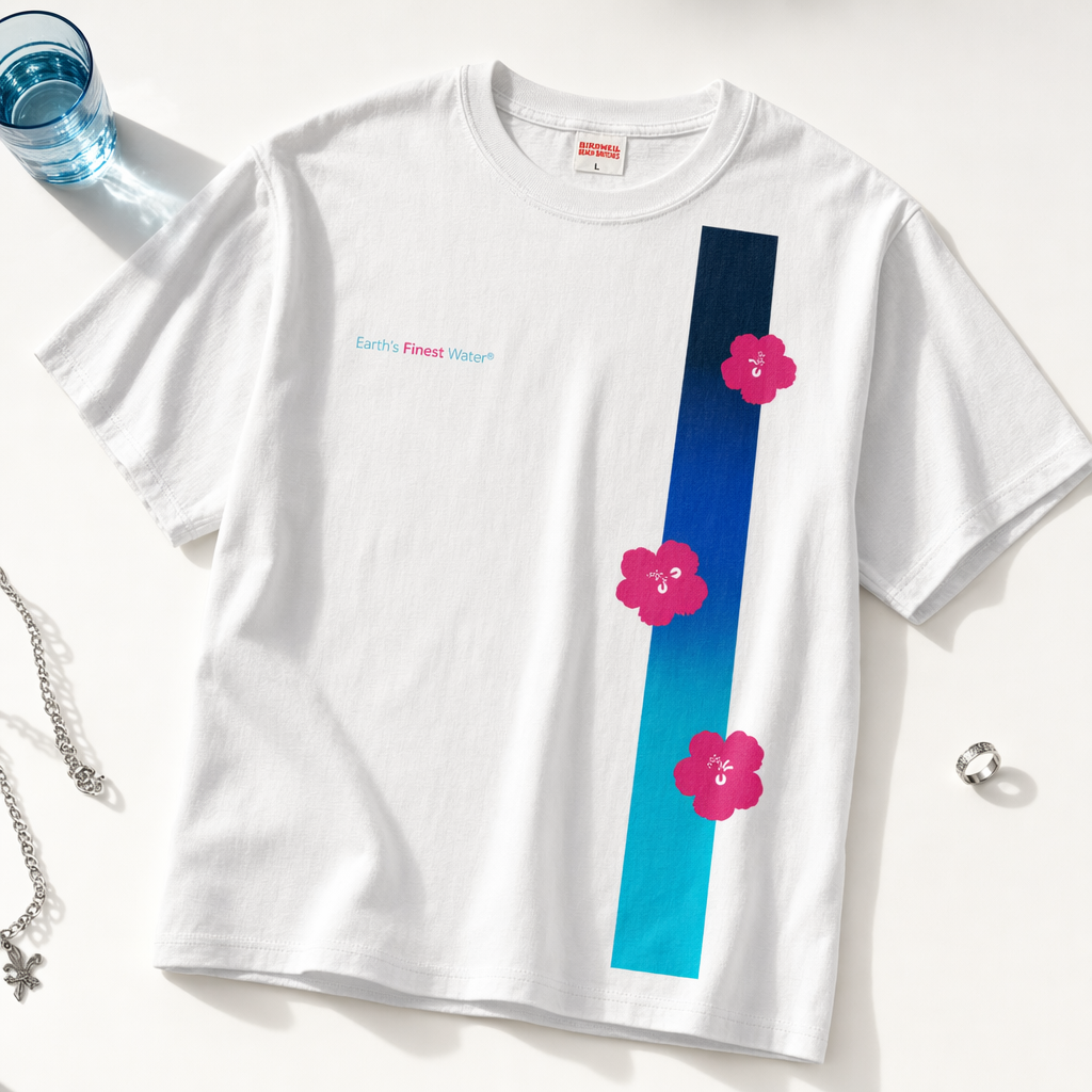 Photorealistic flat-lay of a vintage white unisex t-shirt (use provided silhouette) styled for Gen Z streetwear. The shirt is laid on a stark white tabletop with subtle soft shadows. Front graphic: a bold, off-center vertical bar running from mid-chest to hem along the right side, inspired by the FIJI bottle label proportions. The bar has a crisp color-block gradient: navy (#041C2C) at the top, blending into FIJI blue (#003DA5) then into bright turquoise (#00C1D5) at the bottom. Overlapping the bar in three staggered positions are small, solid magenta (#E10098) hibiscus icons, like playful stamps. On the left chest, small size, minimalist sans-serif text in navy: “Earth’s Finest Water®” with “Earth’s” and “Water®” in light blue (#BBDDE6) and “Finest” in magenta to highlight the word. Print finish: slightly textured screen print. The tee silhouette appears slightly boxy with dropped shoulders, high-quality ribbed collar, seams and stitching clearly visible. Add subtle styling: a partially visible blue-tinted water glass and silver jewelry at the edges of the frame, out of focus. Lighting: bright, diffused daylight from a large window, giving a clean, high-fashion editorial feel. Camera: overhead shot, zoomed in enough to showcase fabric and print detail while still showing the full shirt shape.