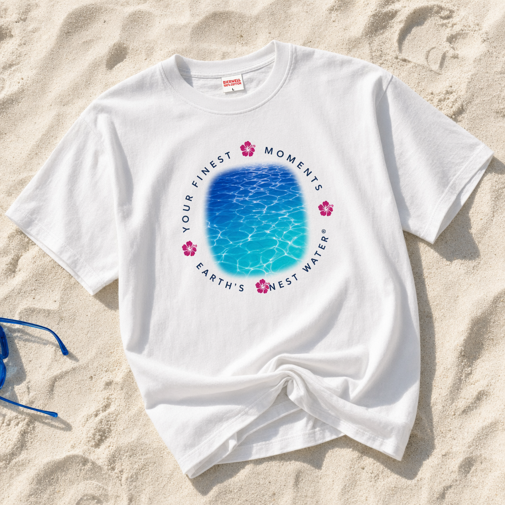 Photorealistic flat-lay of a vintage white unisex t-shirt (use provided silhouette) on a white sand-textured surface, giving a subtle beach vibe while still reading as “on white.” The shirt is gently twisted at the hem for a casual TikTok-ready styling. Front graphic: large central circular design with a soft-edged inner square, symbolizing a portal to “Your Finest Moments.” The inner square uses a gradient from FIJI blue (#003DA5) to bright turquoise (#00C1D5) with a faint water ripple effect. Around the square, in a circular layout, small uppercase text in navy (#041C2C): “YOUR FINEST MOMENTS • EARTH’S FINEST WATER®”. Four tiny magenta (#E10098) hibiscus marks sit at the cardinal points, replacing dots. Print finish: smooth, slightly matte, no gloss. The shirt fabric appears slightly heavyweight with a boxy fit, dropped shoulders and a thick ribbed collar, aimed at Gen Z aesthetics. Around the shirt edges, faint impressions of footprints and a single FIJI-blue tinted sunglasses arm peek into frame, all in soft focus to keep the tee the hero. Lighting: bright natural sunlight from the top, creating gentle shadows and sparkling highlights in the sand texture without overpowering the white of the shirt. Camera: overhead shot, slightly angled to one side for a less clinical, more lifestyle feel.