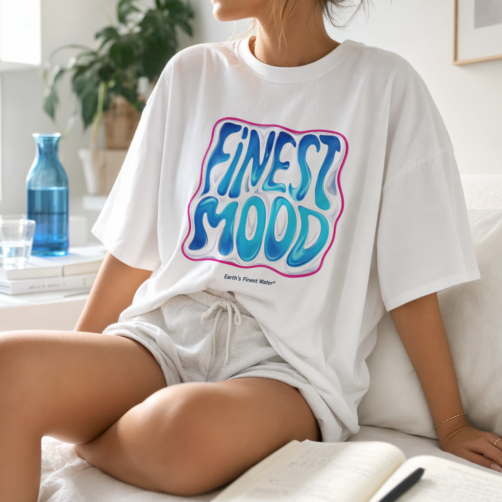 Photorealistic image of a vintage white oversized t-shirt (use provided silhouette) worn by a cropped, faceless model sitting on a white sofa in a bright, minimal living room. Only torso and part of thighs visible to keep focus on the tee. Front graphic: a playful, slightly distorted square motif like a liquid mirror, outlined in magenta (#E10098). Inside, warped, reflective typography in FIJI blue gradient (#003DA5 to #00C1D5) reading “FINEST MOOD” with soft wave distortions, as if seen through water. Below in tiny navy (#041C2C) text: “Earth’s Finest Water®”. The shirt is slightly tucked into relaxed shorts, emphasizing a laid-back, at-home ritual vibe (drinking water, journaling, unwinding). The cotton looks ultra-soft with visible weave and a slightly brushed surface, sleeves wide and relaxed. Background: blurred white walls, a hint of a houseplant and a FIJI-blue glass carafe on a white coffee table. Lighting: natural morning light from a window, soft and airy, creating gentle shadows and a glowy, wellness-focused mood. Camera: three-quarter angle, medium close-up on the torso, with the graphic sharp and the background gently out of focus.