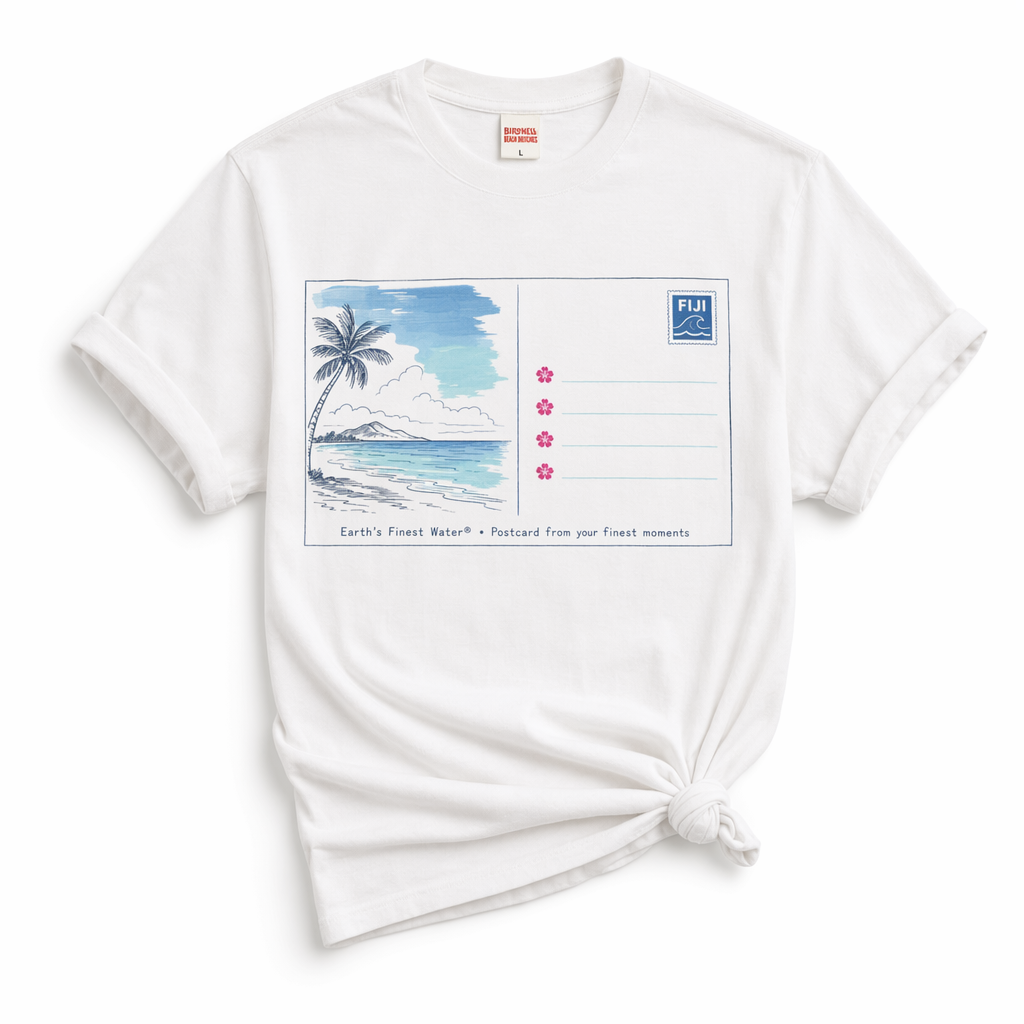 Photorealistic flat-lay mockup of a vintage white unisex t-shirt (use provided silhouette) on a crisp white background, shot like a lookbook page. Front graphic: a large, minimalist back-of-postcard layout centered on the chest. On the left half of the graphic, thin navy (#041C2C) lines sketch a calm shoreline with a palm tree and water, very minimal, almost like a travel doodle. The sky and water areas are filled with soft FIJI blues (#003DA5, #00C1D5, #BBDDE6) in loose, painterly blocks. On the right half, four horizontal lines for an address in light blue (#BBDDE6), with small magenta (#E10098) hibiscus icons as bullet points. At the top right, in a small FIJI blue square stamp: “FIJI” and a tiny wave icon. Along the bottom edge of the postcard graphic, in small, relaxed type: “Earth’s Finest Water® • Postcard from your finest moments”. Print feels soft and embedded, like high-end DTG. The tee is styled with sleeves slightly rolled and a subtle half-knot at the hem to lean into Gen Z aesthetics. Lighting: evenly diffused, high-key, with delicate shadows to define the silhouette, no harsh contrasts. Camera: overhead, full shirt visible with enough negative space around to highlight the design and layout.