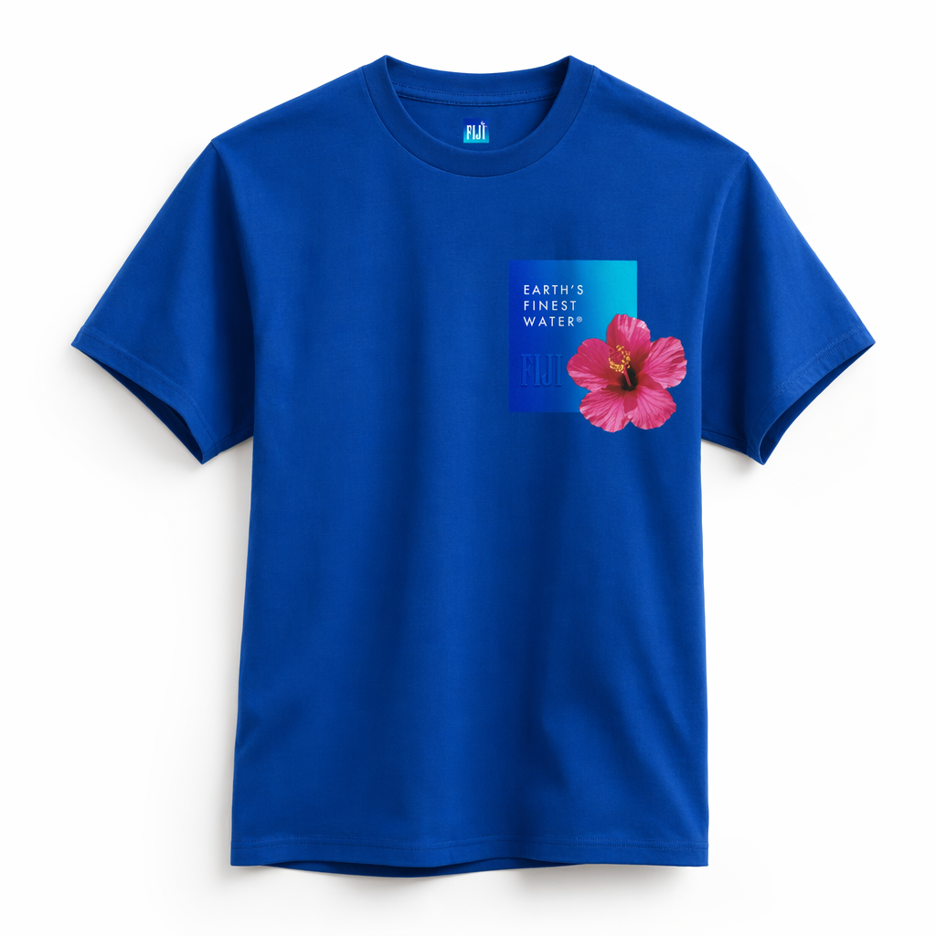 Photorealistic flat lay mockup of a unisex Gen Z streetwear T‑shirt, using the provided silhouette 06_golden-hawaii-t-shirt-arctic-blue.jpg for shape and drape. The tee lies perfectly centered on a clean pure-white studio background, lit with soft diffused daylight from above for minimal shadows. Fabric is premium midweight organic cotton with a smooth, slightly matte finish. Color of the shirt is FIJI primary blue (#003DA5). On the chest, a square, off-center graphic inspired by the iconic FIJI bottle label: a vertical FIJI blue-to-bright-light-blue gradient (#003DA5 to #00C1D5) with a bold hibiscus-magenta (#E10098) tropical hibiscus illustration partially breaking out of the square, playful but refined. Overlayed in crisp white small caps: “EARTH’S FINEST WATER®” stacked, with FIJI logo subtly embossed below in tonal blue. Back neck hit: a tiny square FIJI cap-blue icon as a nod to the bottle cap. Styling is minimalist but fashion-driven, like an Aritzia or COS product page, framed waist-up with a slight angled top-down camera so you see collar, sleeves, and hem. No props, no models, just the shirt on white, hyper-detailed seams, stitching, and fabric texture, high-end ecommerce lighting.