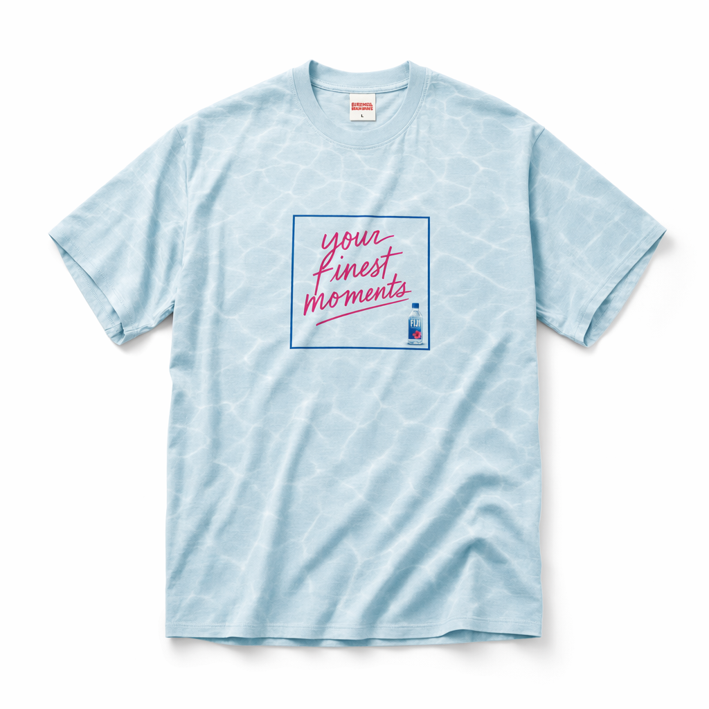 Photorealistic flat lay of a relaxed-fit Gen Z tee, using silhouette 06_golden-hawaii-t-shirt-arctic-blue.jpg for shape, placed on a bright white seamless background. Fabric: ultra-soft, slightly drapey cotton-modal blend with a silky, premium hand feel. Base color is a light tropical ice blue (#BBDDE6) with an allover but subtle wavy water pattern in slightly darker light blue, evoking the FIJI aquifer. Center chest graphic: a playful, hand-drawn script reading “your finest moments” in hibiscus magenta (#E10098), underlined by a minimalist square outline in FIJI blue (#003DA5). Inside the square’s bottom right corner, a tiny, photorealistic FIJI bottle icon sits like a fashion logo, very discreet. The design feels like a limited-edition collab tee from a cool resort brand, not overt merch. Lighting is soft and even, studio-style, with faint shadows to show the folds around the sleeves and hem. Camera is top-down, slightly zoomed out so the whole garment is visible on clean white, with crisp detail on the water texture, seams, ribbed collar, and tag area.