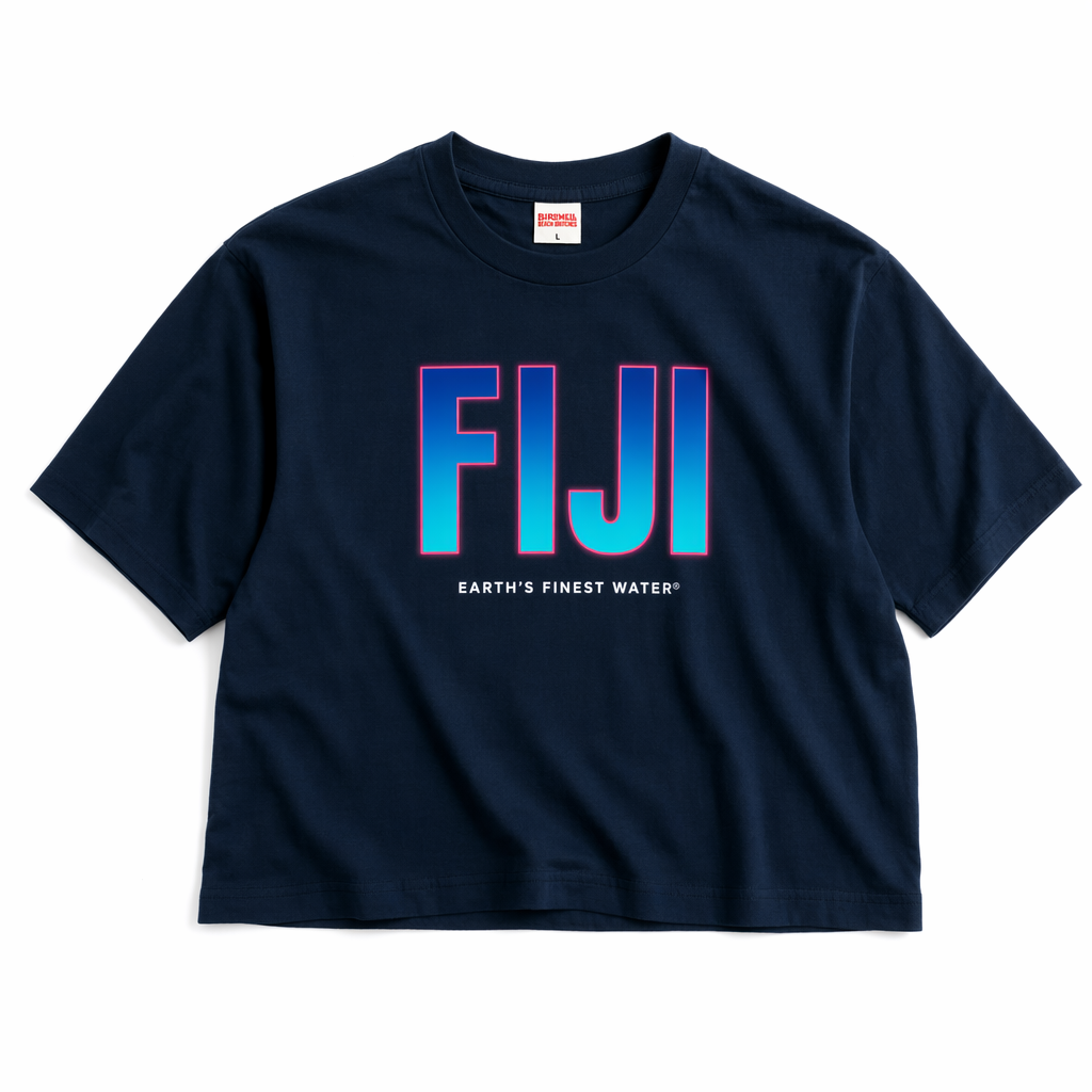 Photorealistic mockup of a boxy, cropped Gen Z T-shirt using silhouette 06_golden-hawaii-t-shirt-arctic-blue.jpg, laid flat on a pure white background. Base color: deep navy (#041C2C). Across the chest is a bold, fashion-forward gradient wordmark: the word “FIJI” in large, clean sans serif letters filled with a vertical blend from FIJI blue (#003DA5) at the top to bright light blue (#00C1D5) at the bottom, with a thin hibiscus magenta (#E10098) outline glowing softly around each letter, giving a neon-sign feel without being tacky. Beneath in tiny, understated caps: “EARTH’S FINEST WATER®” in white, centered. The print has a smooth, slightly glossy finish against the matte cotton jersey. Lighting is cool, bright, and evenly diffused from both sides to highlight the gradient and keep the white background immaculate. The camera angle is perfectly overhead, capturing the tee from neck to hem, with subtle natural wrinkles for realism. Overall mood: confident, minimalist, and streetwear-ready, like a drop from a trendy Gen Z brand.