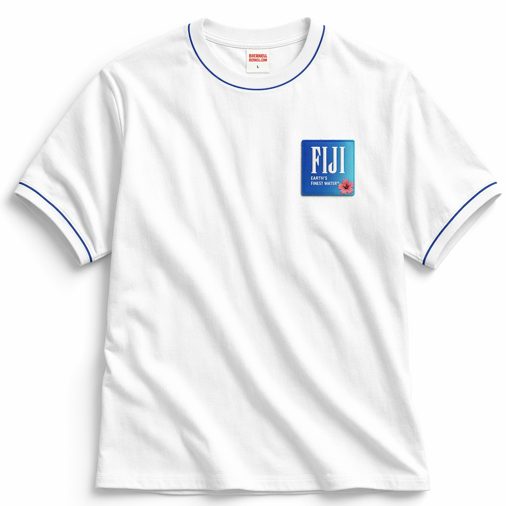 Photorealistic product shot of a relaxed unisex tee using silhouette 06_golden-hawaii-t-shirt-arctic-blue.jpg on a crisp white backdrop. Fabric is slightly heavier premium cotton with visible weave, giving a luxurious yet casual look. Shirt body is pure white, acting as a canvas. Around the collar and sleeve hems, there is a thin, continuous FIJI blue (#003DA5) piping detail. On the left chest, an embroidered square patch: gradient from FIJI blue to bright aqua (#003DA5 to #00C1D5) with a tiny magenta hibiscus icon in the lower corner, and subtle white text “FIJI” above “EARTH’S FINEST WATER®.” The embroidery is high-density, slightly raised, giving a tactile, boutique feel. Lighting is bright and soft, from slightly above and to the left, creating gentle shadow under the sleeves to emphasize form. Camera is overhead but slightly closer, framing just beyond the edges of the tee so all details are prominent. The vibe is quiet luxury and everyday ritual, like a go-to white tee upgraded by refined branding.