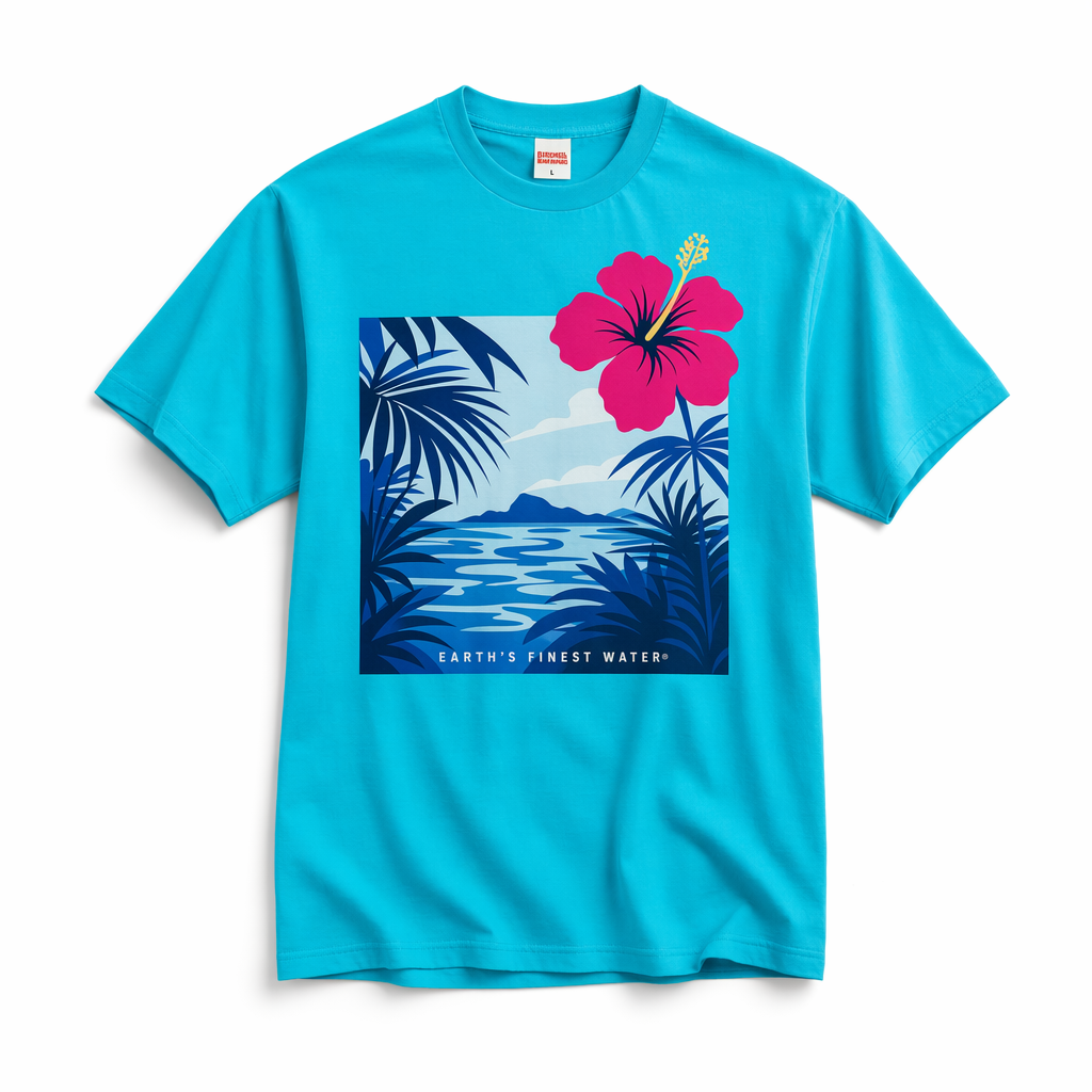 Photorealistic flat lay of a Gen Z oversized T-shirt using silhouette 06_golden-hawaii-t-shirt-arctic-blue.jpg, placed on a pure white seamless background with a slight studio shadow. Shirt base color is FIJI electric blue (#00C1D5) with a smooth jersey finish. Across the front, a large stylized graphic of an island escape scene confined inside a perfect square: layered palm leaves, soft sky gradients, and abstract water ripples rendered in tones of FIJI blue (#003DA5), light blue (#BBDDE6), and navy (#041C2C). A single, vibrant hibiscus in magenta (#E10098) overlaps the top edge of the square, breaking the grid in a playful way. Overlaid in small, centered caps at the bottom of the square: “EARTH’S FINEST WATER®” in crisp white. The design feels like a collectible art tee, not tourist merch. Lighting: even, cool-toned studio lighting from above to keep colors true and saturated. Camera: direct overhead, wide enough to show the entire tee silhouette and negative white space around it, emphasizing the bold graphic.
