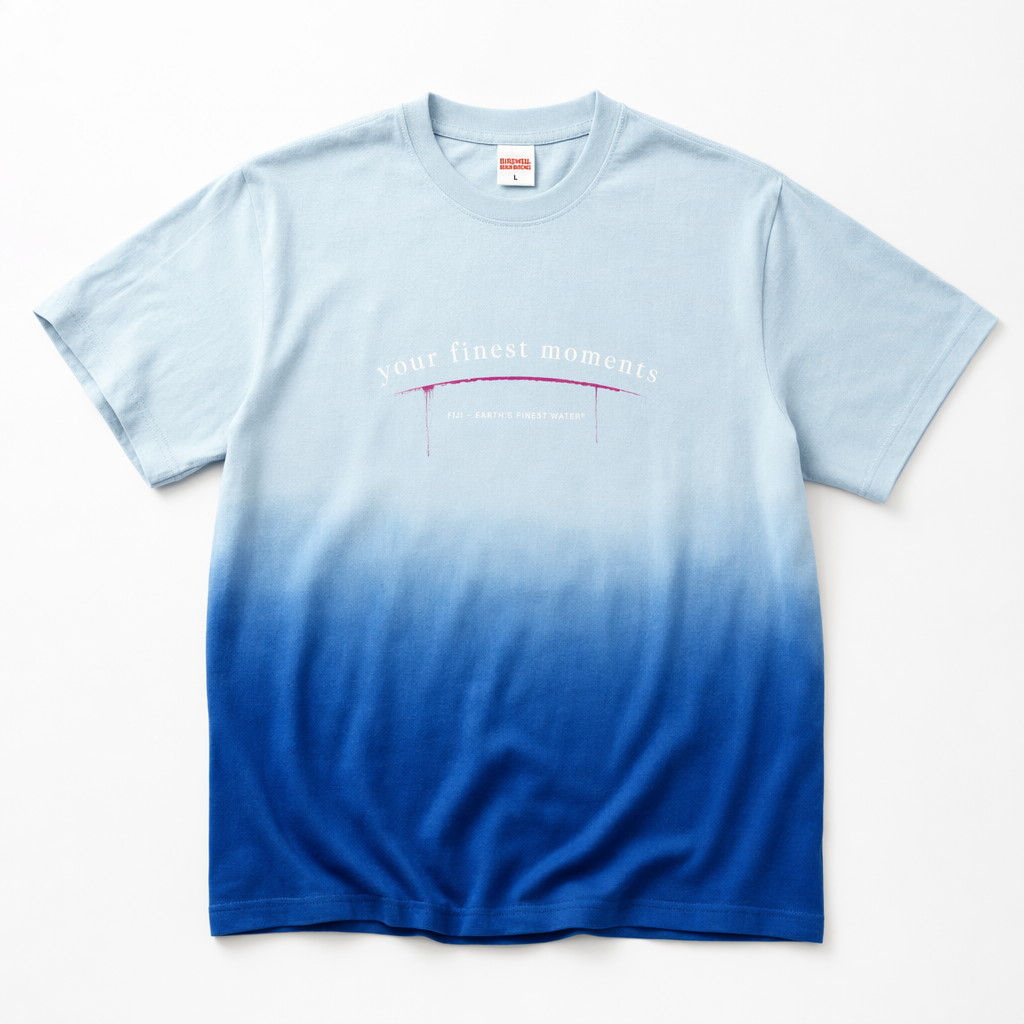 Photorealistic mockup of a soft, relaxed tee using silhouette 06_golden-hawaii-t-shirt-arctic-blue.jpg, lying on a bright white background. The tee features a split-tone dip-dye effect: upper half in light blue (#BBDDE6), gradually blending into FIJI blue (#003DA5) at the lower half, with a smooth, premium gradient finish. Centered on the chest is a minimalist, slightly arched line of text in white: “your finest moments,” with a thin hibiscus magenta (#E10098) underline that subtly drips down like watercolor into the blue. Below, in tiny, sleek sans serif: “FIJI – EARTH’S FINEST WATER®”. The print is soft-hand ink, integrated with the fabric for a high-end feel. Lighting is soft and naturalistic, as if near a window, creating barely-there shadows around the sleeves and hem. Camera angle is directly overhead, capturing the tee fully within a field of clean white, with enough resolution to see the gradient texture and stitching.