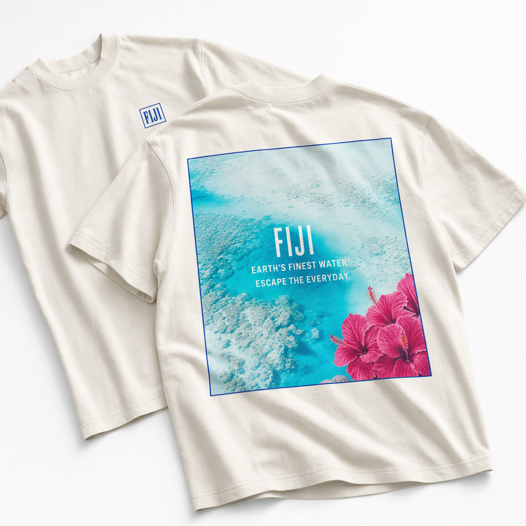 Photorealistic flat lay of an oversized resort-style T-shirt using silhouette 06_golden-hawaii-t-shirt-arctic-blue.jpg, displayed on a pure white studio surface. Shirt color: soft off-white with a hint of warm cream, to feel lived-in and premium. Back of the tee is shown as the hero side: a large square graphic occupying most of the back, framed by a thin FIJI blue (#003DA5) border. Inside the square, an abstract aerial view of turquoise water and reef, rendered as soft gradients of bright light blue (#00C1D5) and light blue (#BBDDE6). In the lower right corner of the square, a small cluster of magenta (#E10098) hibiscus flowers. Over the water image, clean white text stacked off-center: “FIJI / EARTH’S FINEST WATER® / ESCAPE THE EVERYDAY.” Front of the tee (partially visible from the neck fold) has only a tiny FIJI blue square logo at the left chest. Lighting is bright, cool, and even, making the white background and off-white fabric feel airy and relaxed. Camera is overhead and slightly rotated a few degrees for a casual, editorial feel while still clearly showcasing the silhouette and artwork.