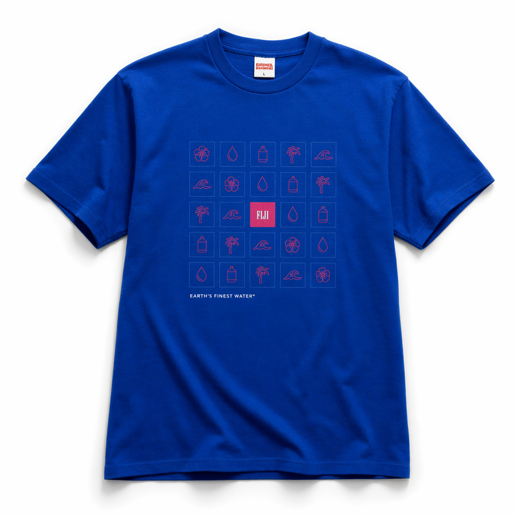 Photorealistic product mockup of a unisex tee using silhouette 06_golden-hawaii-t-shirt-arctic-blue.jpg, laid flat on stark white with subtle natural shadows. Base color is deep FIJI blue (#003DA5). The design plays with small repeated icons: a grid of tiny tonal blue squares arranged across the chest, each square containing a different minimal line icon related to FIJI—palm tree, drop of water, square bottle, hibiscus, wave—drawn in fine hibiscus magenta (#E10098) lines. One square in the center of the grid is inverted with a solid magenta fill and small white “FIJI” text, acting as a playful focal point. Under the grid, in understated white text aligned left: “EARTH’S FINEST WATER®”. Fabric finish is matte with slight texture, giving a modern streetwear vibe Gen Z would wear daily. Lighting is controlled studio lighting, slightly brighter on the upper half of the tee to emphasize the icon grid. Camera: straight overhead, framed closely so the grid and texture are clearly visible while maintaining white negative space around the tee.