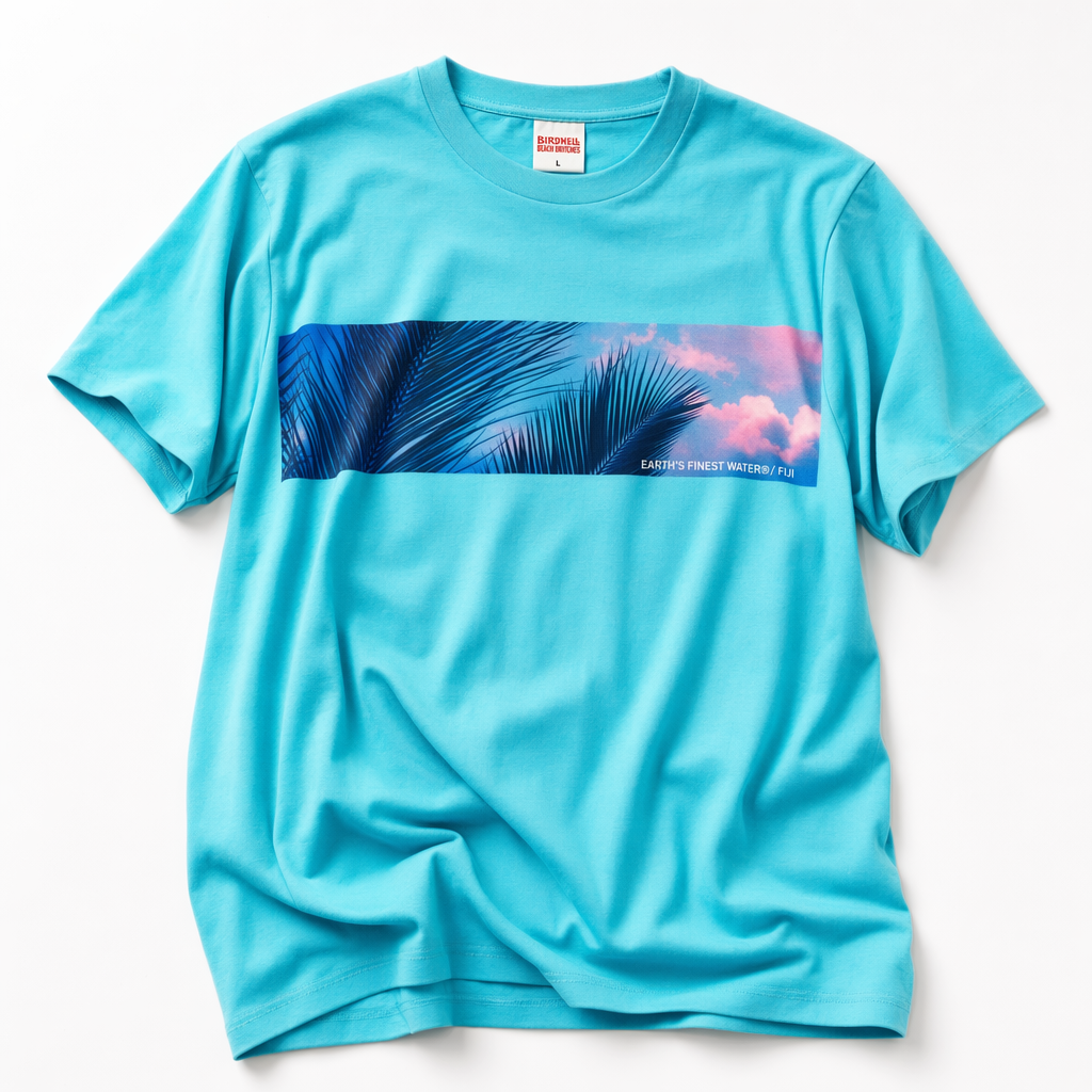 Photorealistic flat lay of a silky-soft lounge T-shirt using silhouette 06_golden-hawaii-t-shirt-arctic-blue.jpg, arranged casually with a few natural folds on a pristine white background. Base color is bright light blue (#00C1D5), evoking clear tropical water. Across the mid-chest is a horizontal band graphic, about one-third the shirt width, featuring a lush, photorealistic close-up of palm fronds and soft-focus sunset sky, in tones of FIJI blue (#003DA5), light blue (#BBDDE6), and subtle magenta-pink highlights (#E10098) in the sky. Within this band, small white text aligned right reads: “EARTH’S FINEST WATER® / FIJI”. The print is rich and high-resolution, like a premium photo tee from a fashion label. Lighting is soft and diffused with a gentle gradient from top brighter to bottom softer, creating depth without harsh shadows. Camera is overhead, slightly elevated and zoomed in so the band graphic is prominent but the whole silhouette remains in frame, giving a cozy, escapist mood.